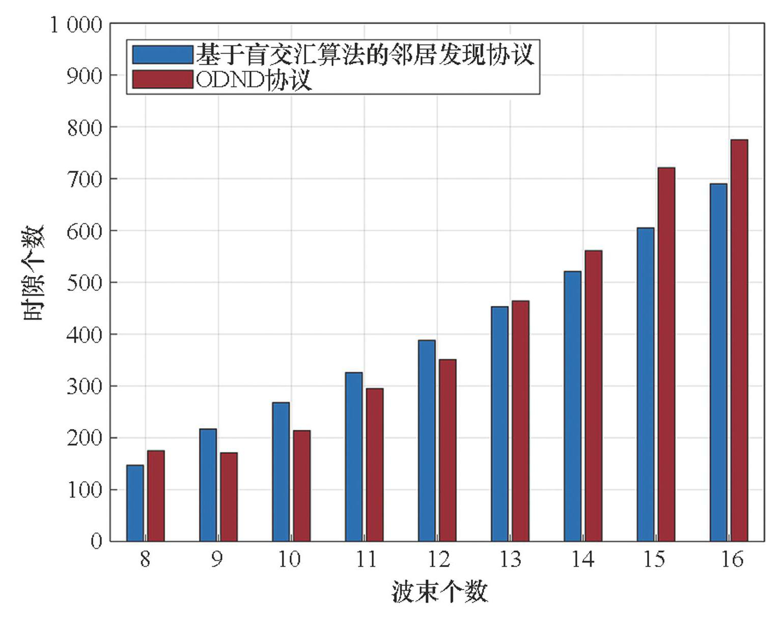 不同算法的邻居发现协议最长邻居发现时间(时隙个数)如图12所示。从图12中可以看出,在不同波束个数条件下,基于盲交汇算法的邻居发现协议最长邻居发现时间均小于ODND协议的最长邻居发现时间。