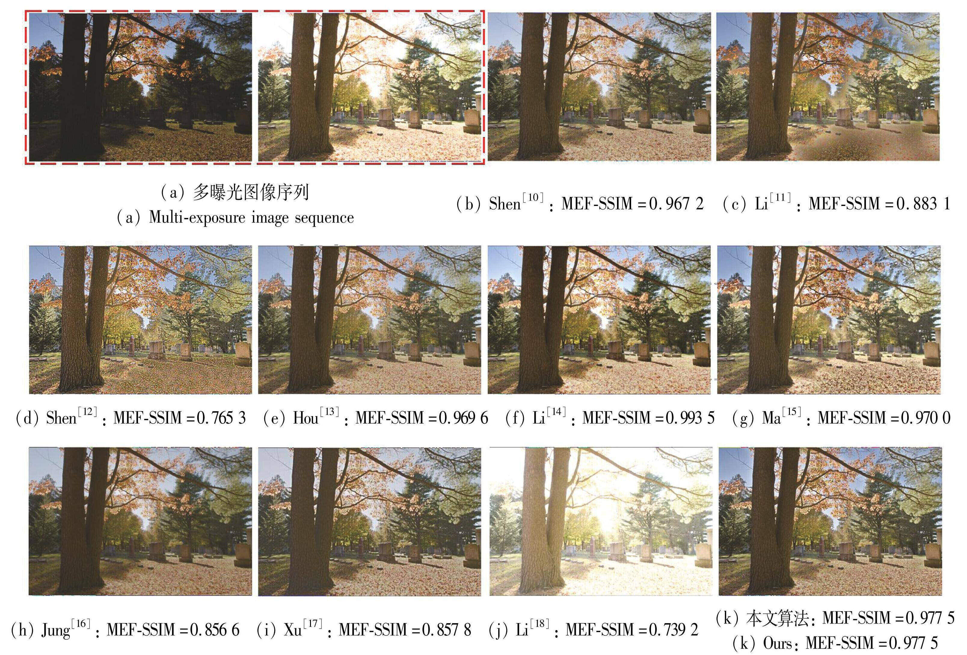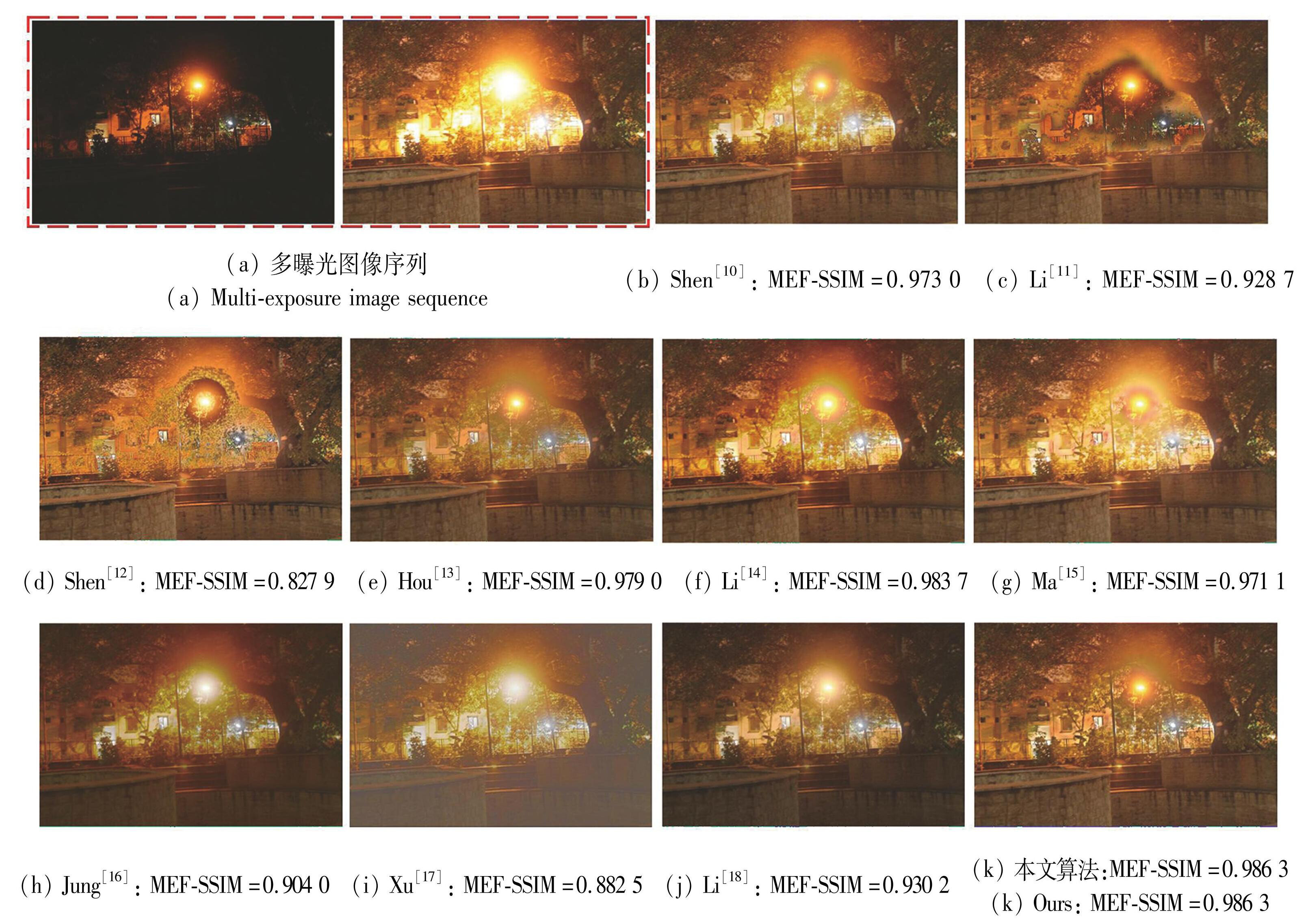 为了验证本文算法的有效性,在公开数据集选取了50组测试数据,包括极端曝光下的夜间场景和曝光较正常的日间场景。采用的对比算法有传统主流算法(文献[10-14])和基于深度学习的算法(文献[15-18]),所有对比算法的代码均由原作者提供,深度学习算法的实验结果是基于原作者提供的网络权重获得的。定量评价指标有:MEF-SSIM[16]指标、平均结构相似度SSIM[33]指标。两者均反映融合图像和待融合图像的结构相似度,是无参考的评价指标,其取值越接近于1,表明融合图像和多曝光图像间的相似度越高。