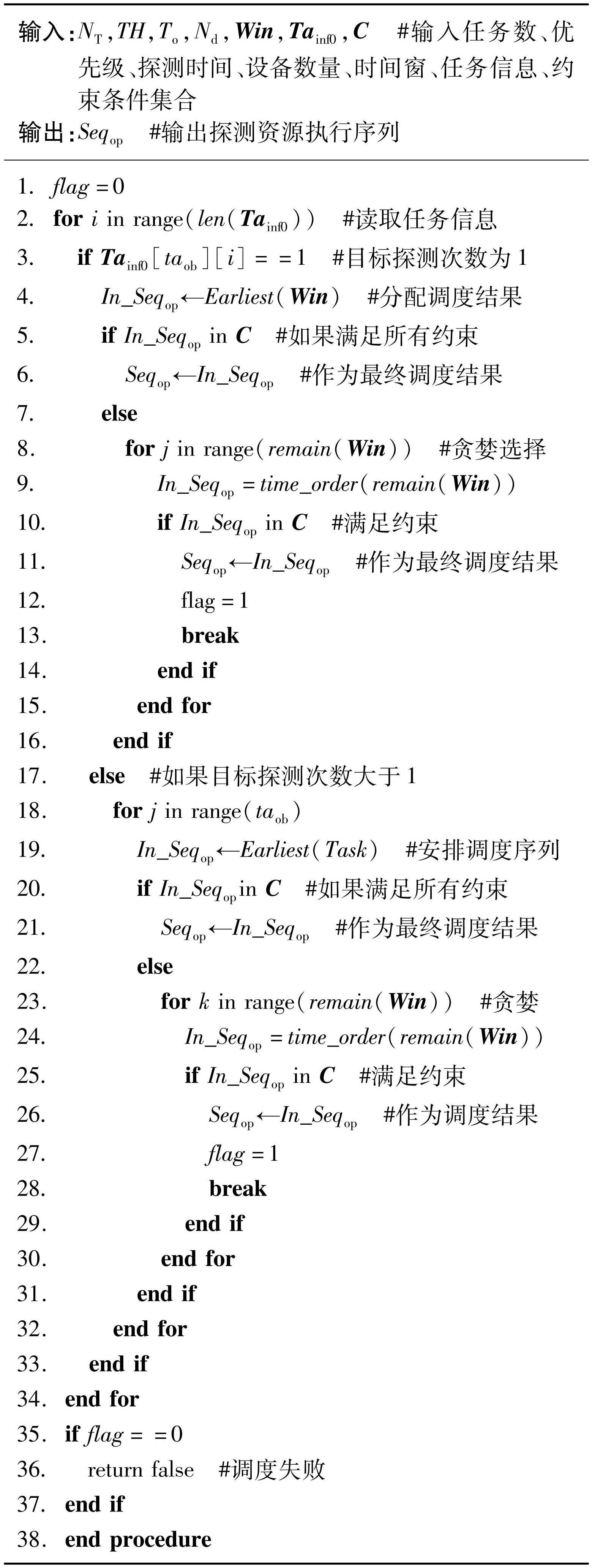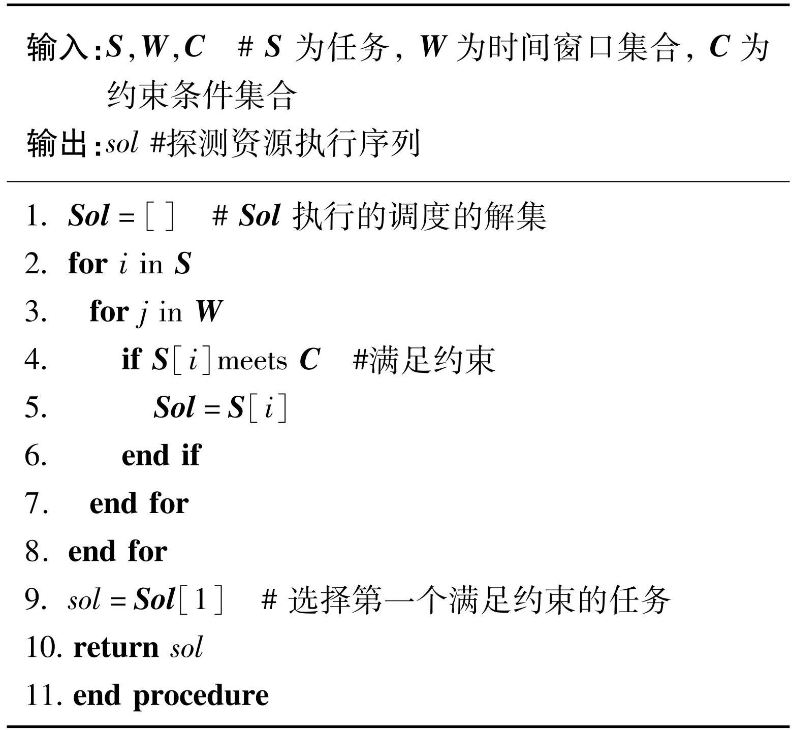 3)自适应策略。综合考虑计算时间与解的质量,设计“紧前”规则作为内层资源调度结果,以此达到调度结果自适应的目的。将每一个先来的任务安排到对应弧段的起始时刻,即令twijstart =twijbot ,后面到达的任务以此类推,自适应策略算法如算法2所示。