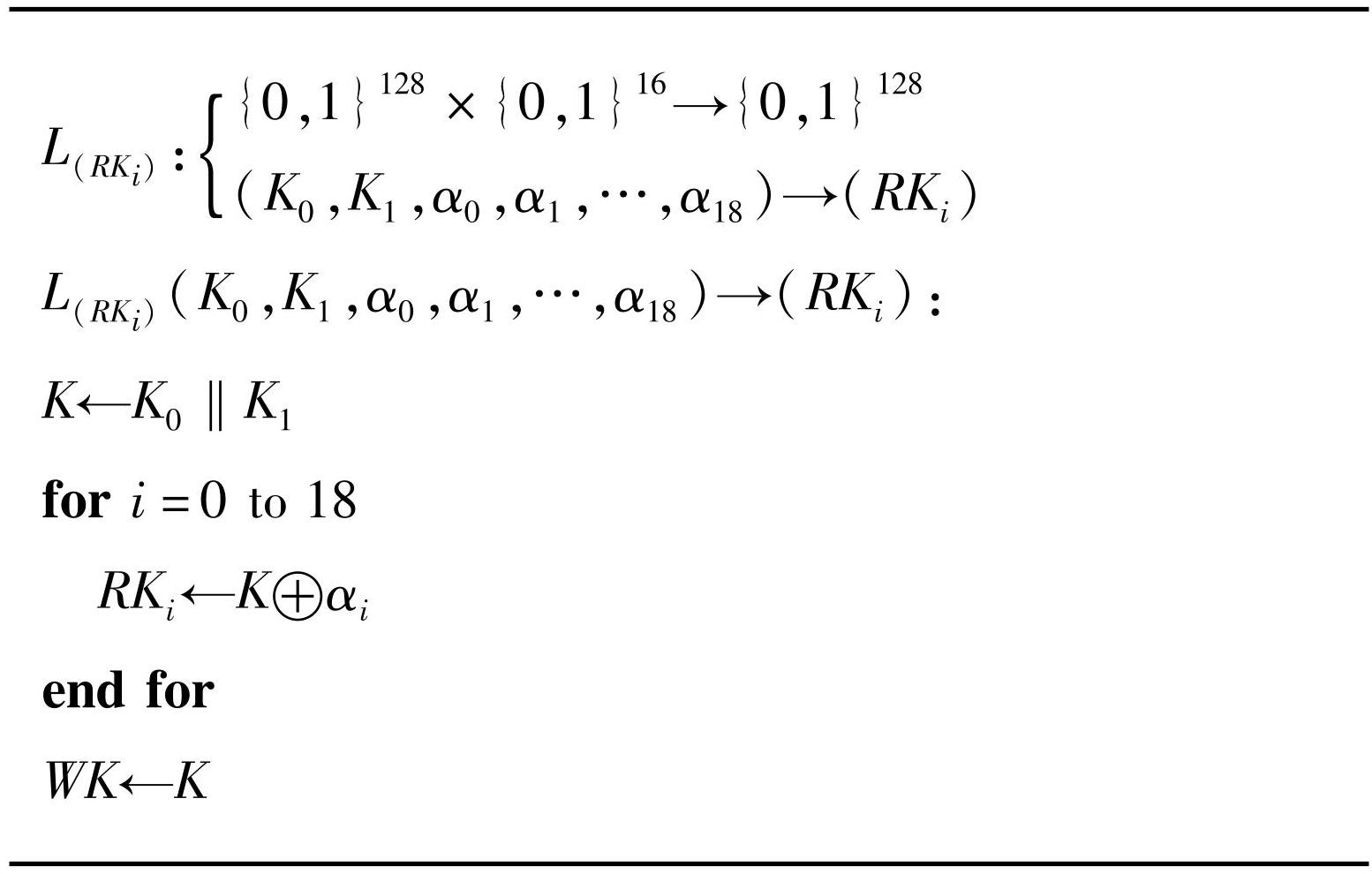 Midori128密钥扩展算法较为简单,如算法2所示。主密钥由两个64 bit的密钥K0和K1级联构成,即K=K0‖K1,主密钥K直接作为白化密钥使用,即WK=K,在首轮使用轮函数之前和最后一轮使用轮函数之后参与运算;轮密钥,其中,为异或运算,αi为轮常数,表2为轮常数所选参数。