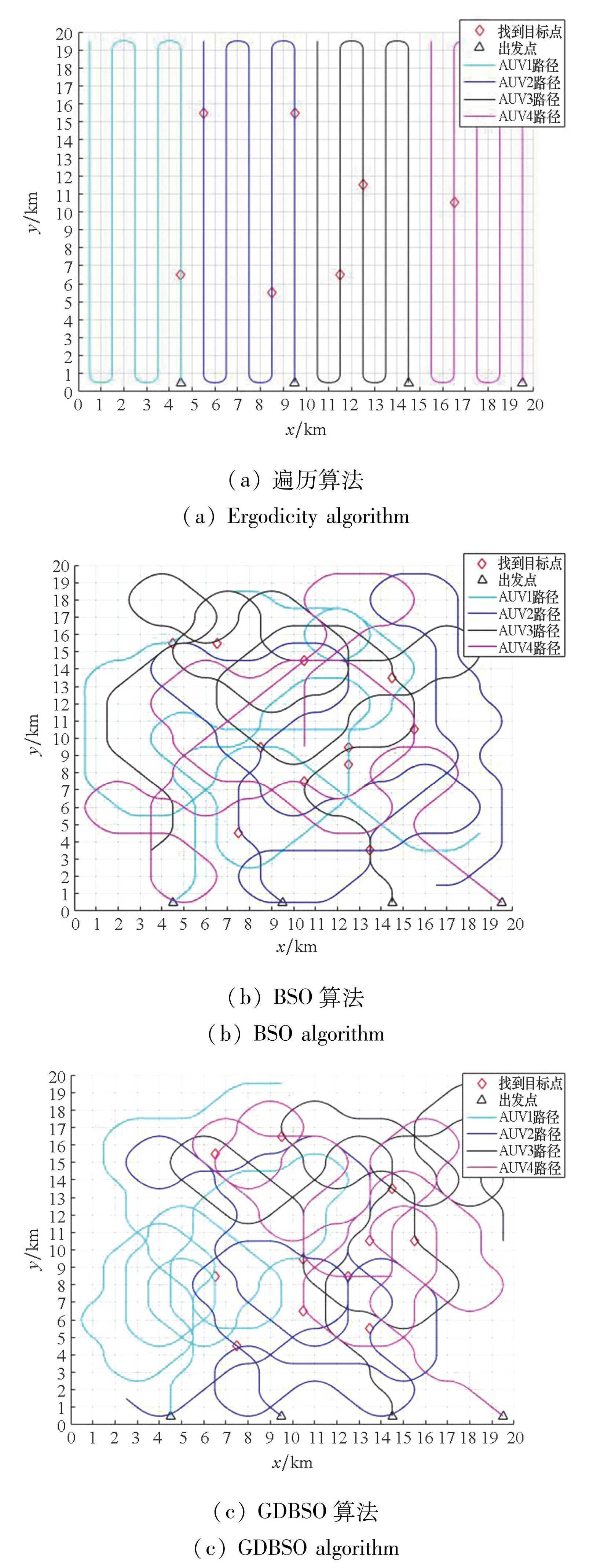 在任务区域设置10个动态目标,其中3个目标作圆周运动、4个目标作螺旋运动、3个目标作布朗运动,分别利用随机算法、遍历算法、BSO算法和GDBSO算法来规划协同搜索路径,算法参数设置参考文献[12]。每组仿真独立运行50次,统计结果如表2所示。