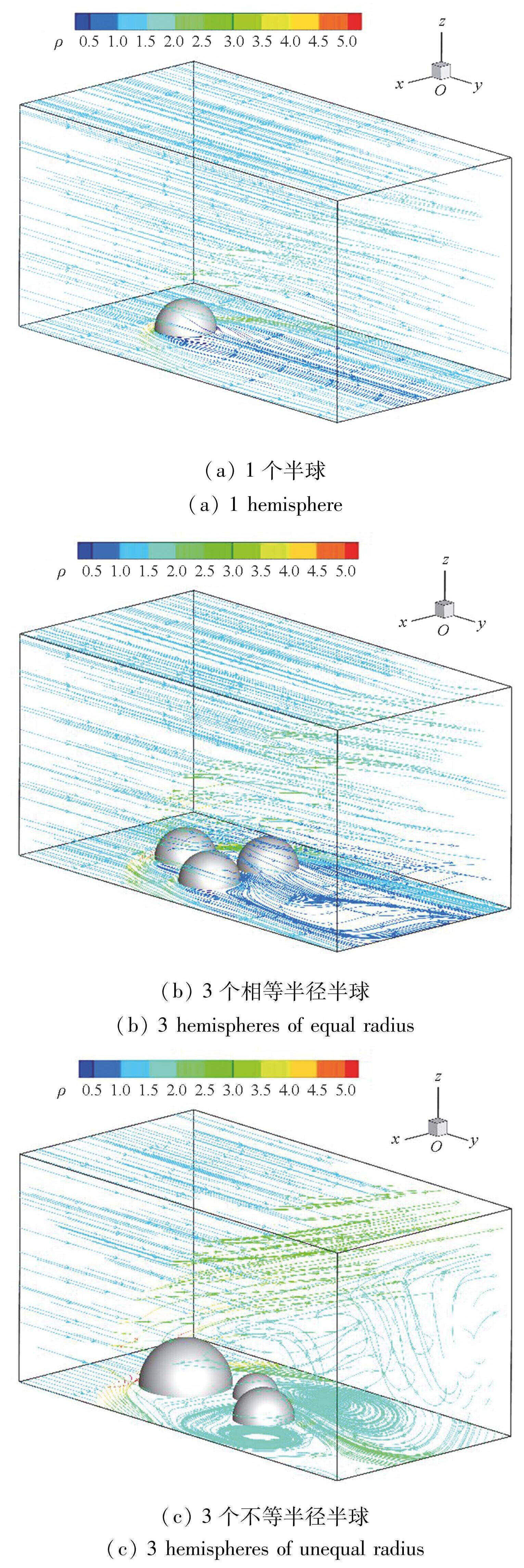 在下边界上放置半径r=0.4的半球,设置为固壁边界。采用本文Auto-CFD技术,可实现随意输入球心坐标和半径就能开始流场模拟。球表面点及其附近过渡节点数目会随着球位置不同而略有变化。图9(a)为球心坐标O1=(1.5,1.5,0)的流场示意图,将流线颜色设置为当地密度云图等级即可得出流线图。