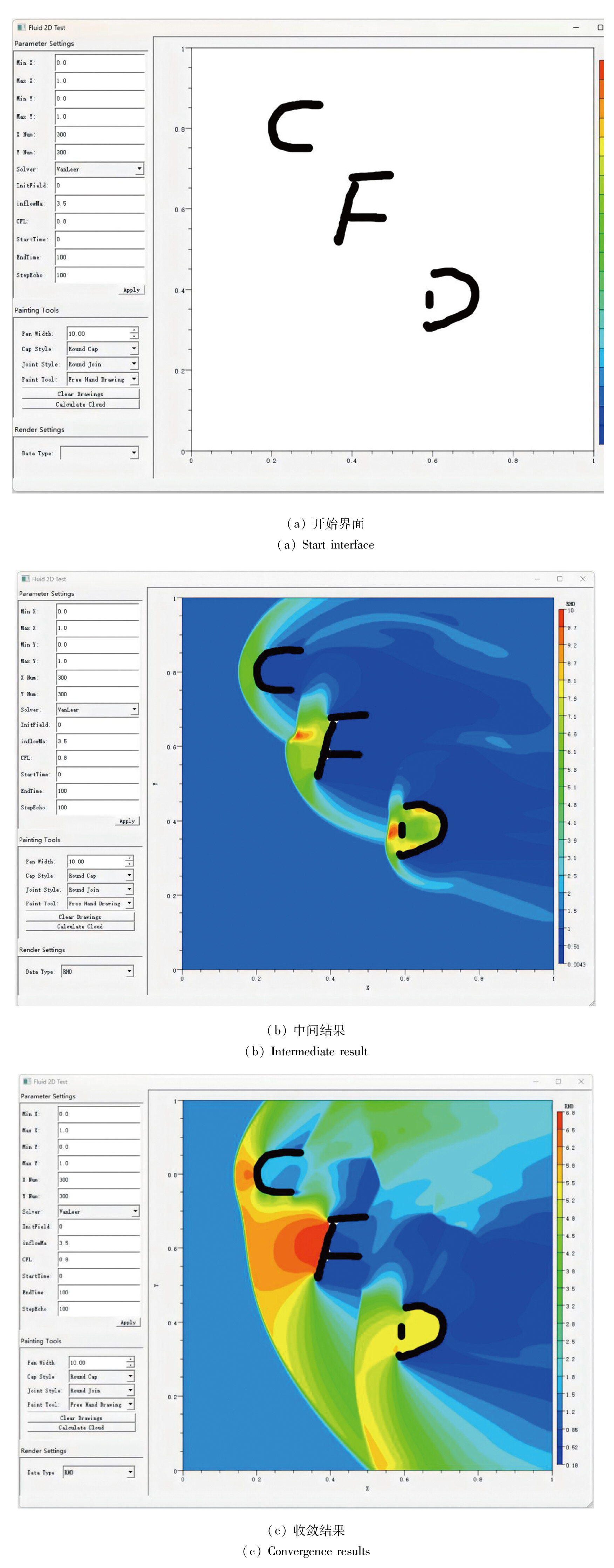 基于上述Auto-CFD技术原理,开发出通过鼠标绘图输入任意几何图形,并自动开始流场计算的演示程序。程序界面如图8(a)所示,在左上侧的控制框内,包括计算区域大小及其笛卡儿网格节点数目等6个几何参数设置;在计算笛卡儿网格时,本文技术兼容目前所有的通量分裂格式和差分格式,程序给出了通量分裂格式和差分格式2个选择按钮,对应的还有CFL条件等2个流场计算参数;其余4个是计算过程控制参数。为便于边界处理,进口边界固定参数的超声速,两侧边界和出口边界直接外推,流场参数只需设置马赫数。右侧方框为实时显示的计算区域,通过鼠标或其他设备输入任意图形,点击计算按钮就可以进行流场模拟,计算开始后时间推进步数满足设置参数条件,存储流场信息并且更新界面内流场云图显示,中间结果和收敛结果如图8(b)和图8(c)所示。该算例表明,对于二维任意复杂外形,基于扎染算法的Auto-CFD具有良好的适应性。