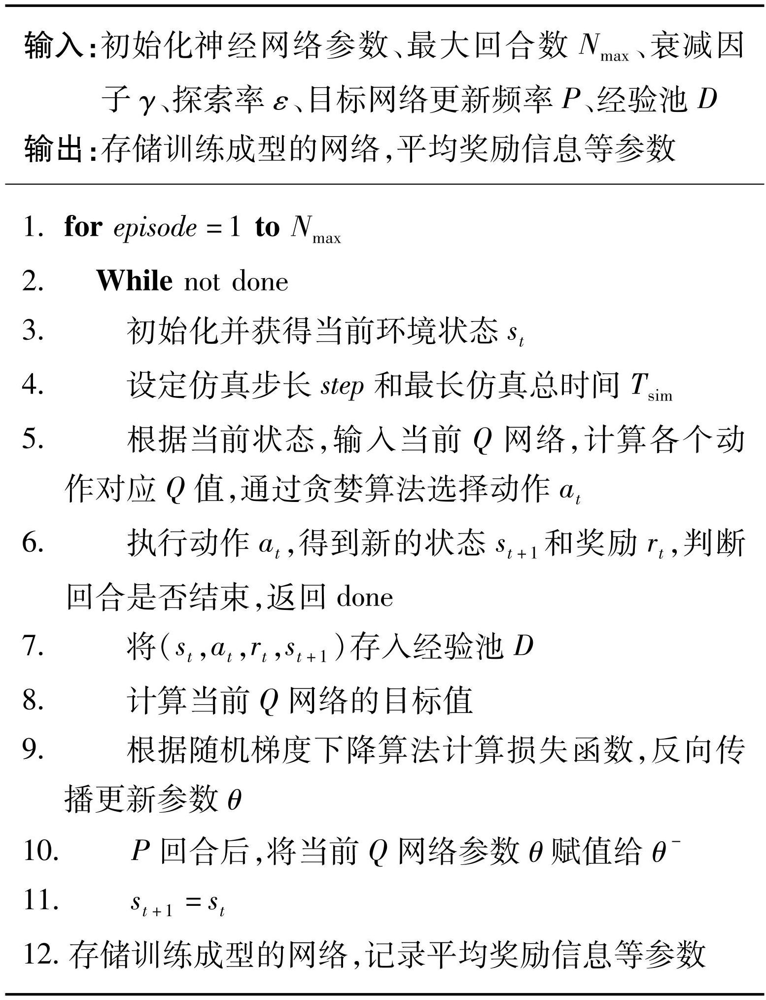 基于动作值函数的Q学习算法通过神经网络拟合状态-动作空间对应的值函数,根据最大动作值函数Q(st,at|θ)确定动作,θ为神经网络参数,训练过程中,控制器与环境进行交互采样并保存数据,将样本空间[st,at,rt,st+1]保存到经验池中,样本空间中的元素分别为状态、动作、奖励以及下一步状态。