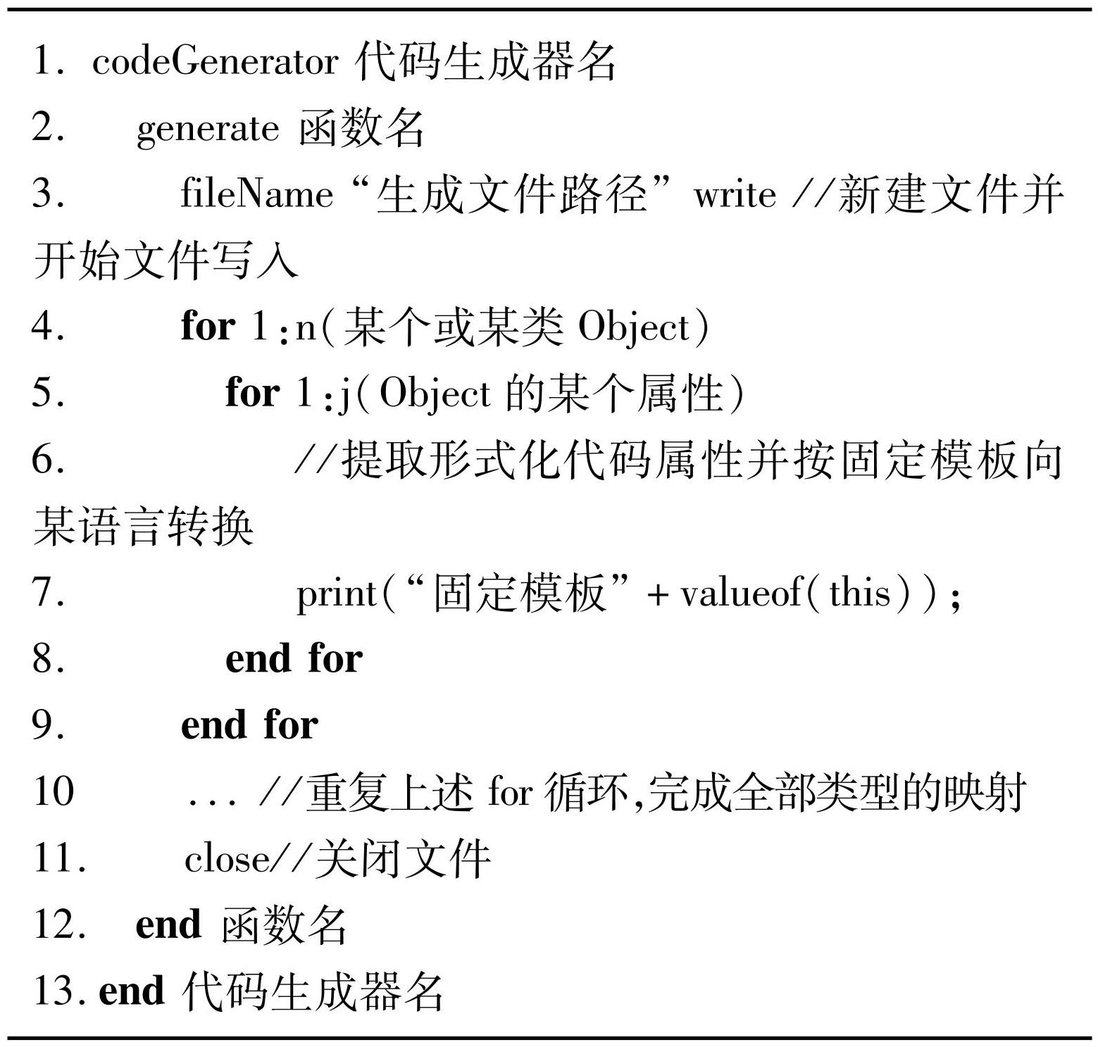 算法1展示了本节提出的利用KARMA语言代码生成功能,实现故障树图模型形式化文本向数值计算模型转换的方案:定义生成的数值计算文件;对同类对象、点元模型的参数属性进行遍历提取;将提取的参数属性填入映射语言的固定模板;写入至文件。