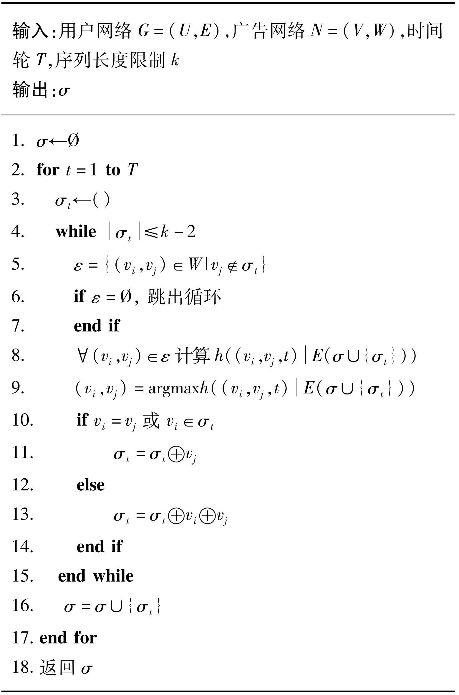 算法1将从空集开始,逐轮选择每一轮的广告序列。用σt表示第t轮推荐的广告序列,初始使σt为空。用ε来表示尾部不在σt中的边的集合,用h((vi,vj,t)|E)=h(E∪{(vi,vj,t)})-h(E)表示广告边(vi,vj,t)在经过用户网络传播后的边际收益。每次贪心地选择边际收益最高的一条边(vi,vj)∈ε,如果边的头部vi不在σt里,或者vi=vj,即该边是自环,则只把vj加入σt的末尾,否则就把vi和vj按顺序依次加入σt的末尾,第11行和第13行中的⊕代表将该符号右边的节点连接到左侧序列的末尾。将每轮选择的σt合并到σ中得到最终的结果。该结果具有合理的下界保证。
