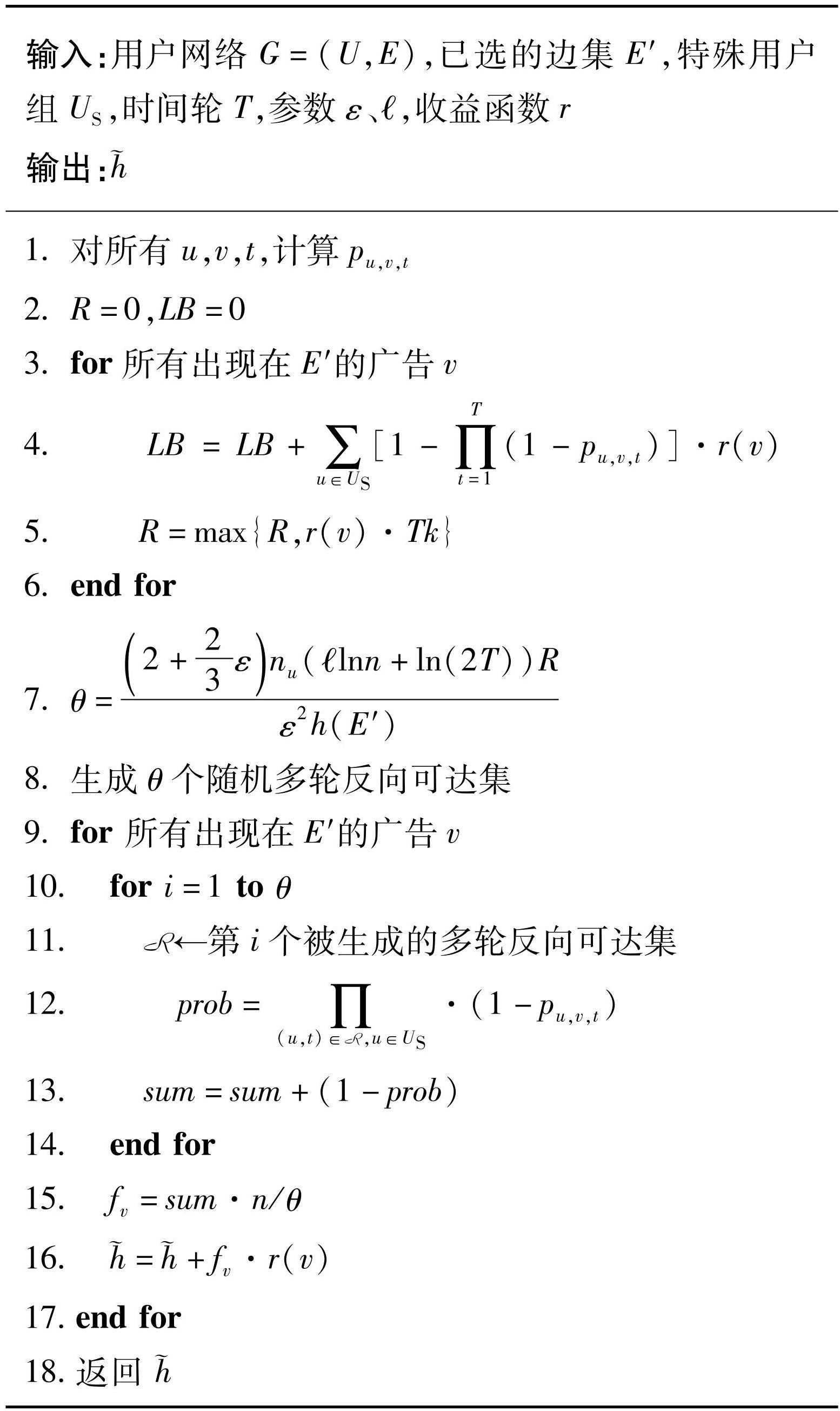 为了快速估算广告边在社交网络G中造成的影响力,即算法1的步骤8,即计算(vi,vj)的边际收益,设计了多轮反向影响力采样方法。