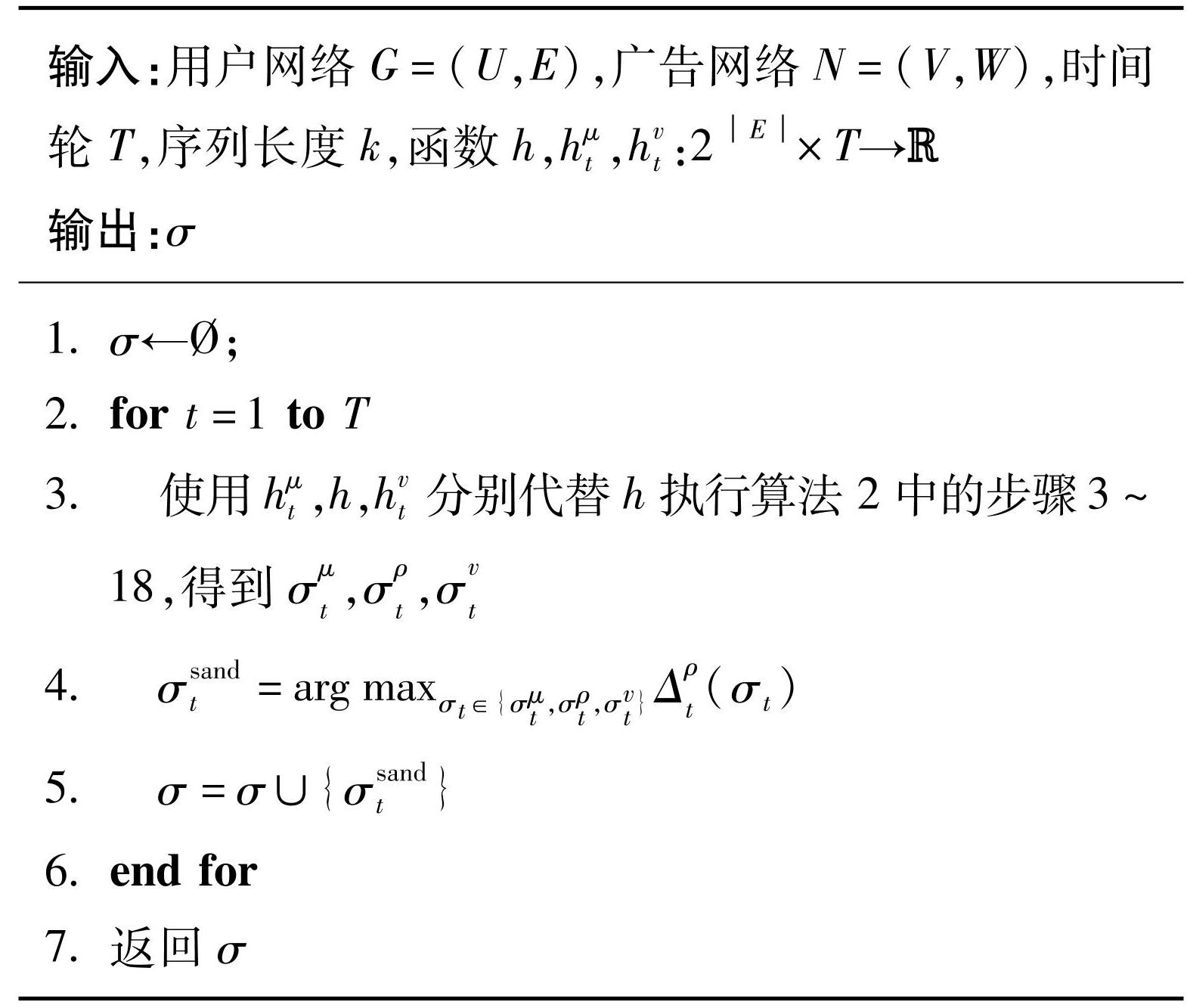 如算法3所示,每一轮分别使用、h和替换原来的h来运行三次贪心算法,得到三个结果σμt,σρt和σvt,然后在其中选择一个原目标函数值最大的作为最终结果σsandt。在每一轮中使用三明治算法并将结果加入答案,得到整体的σ。