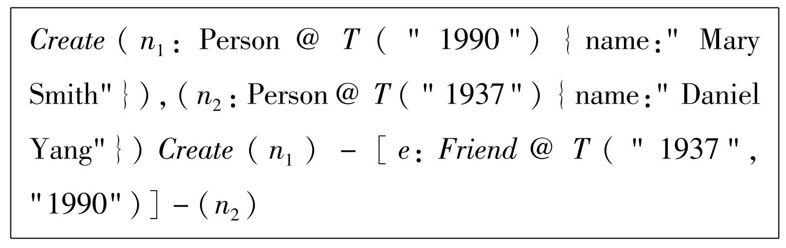 由于关系数据库的广泛应用,传统的时态图数据模型主要基于关系数据模型。但对于关系复杂的数据场景,关系数据模型的性能较差。越来越多的研究表明,在以关系为导向的应用程序中,图数据模型可以提供更好的可解释性、可拓展性和性能。然而,传统的图数据模型并没有专为时间信息设计的结构。虽然可以直接在传统的图数据模型上存储简单的时间信息(例如,往节点中添加一系列的时间点属性,以代表该节点及其各个属性的有效时间),但这种方式无法存储节点的同一属性在不同时间下的属性值,也很容易破坏时间信息的完整性。另一种方式是使用时态图数据模型。时态图数据模型提供专门的数据结构存储时间信息,有效解决了以上问题。但以时态图数据模型存储时间信息后,图查询将会变得极其复杂,且很容易破坏时态约束,此时一个相应的时态图查询语言是必不可少的。