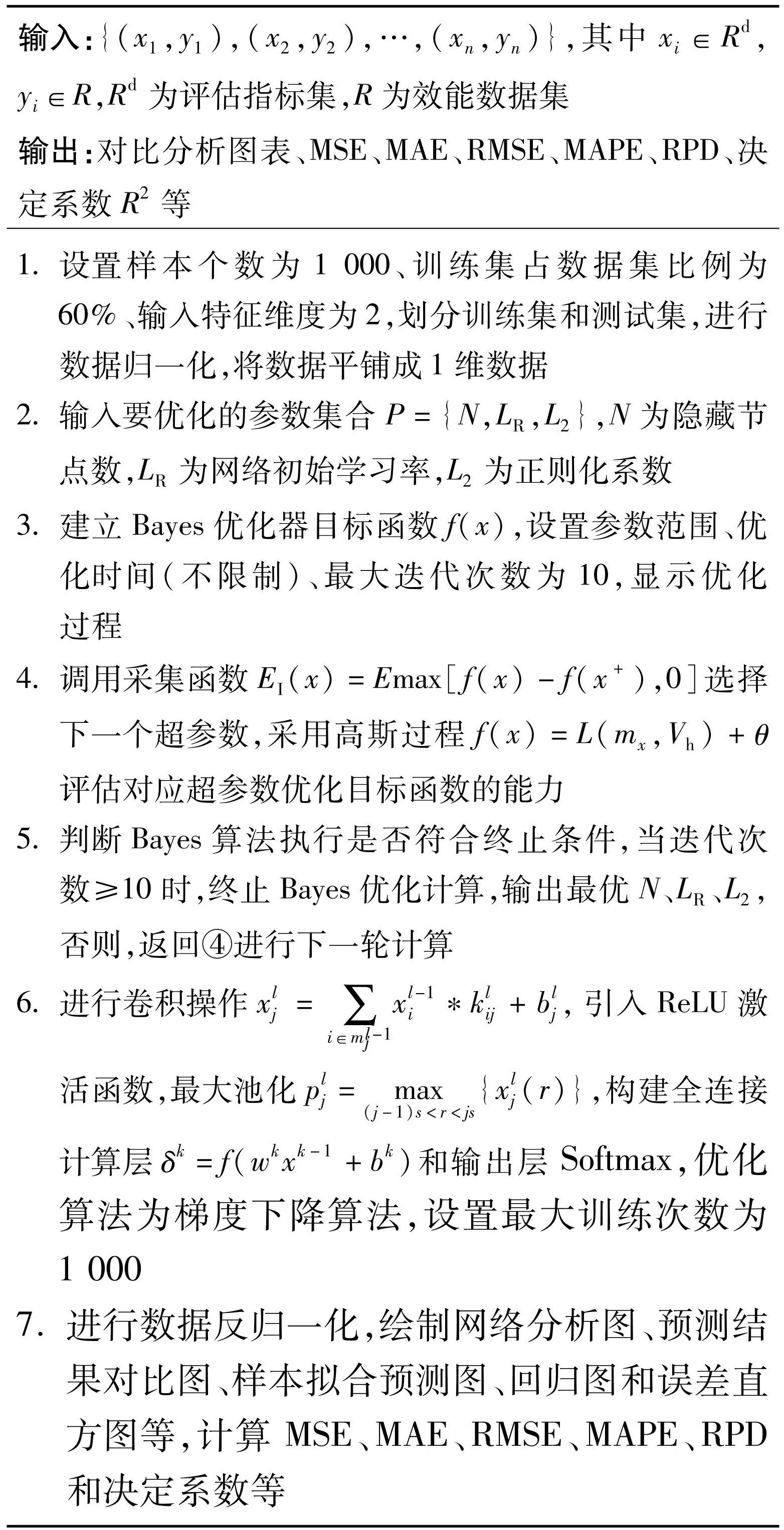 根据2.1节设计的Bayes-CNN算法流程图和2.2节设计的算法步骤,在围绕反导装备体系指标数据的基础上,构建基于Bayes-CNN的效能评估算法,如算法1所示。