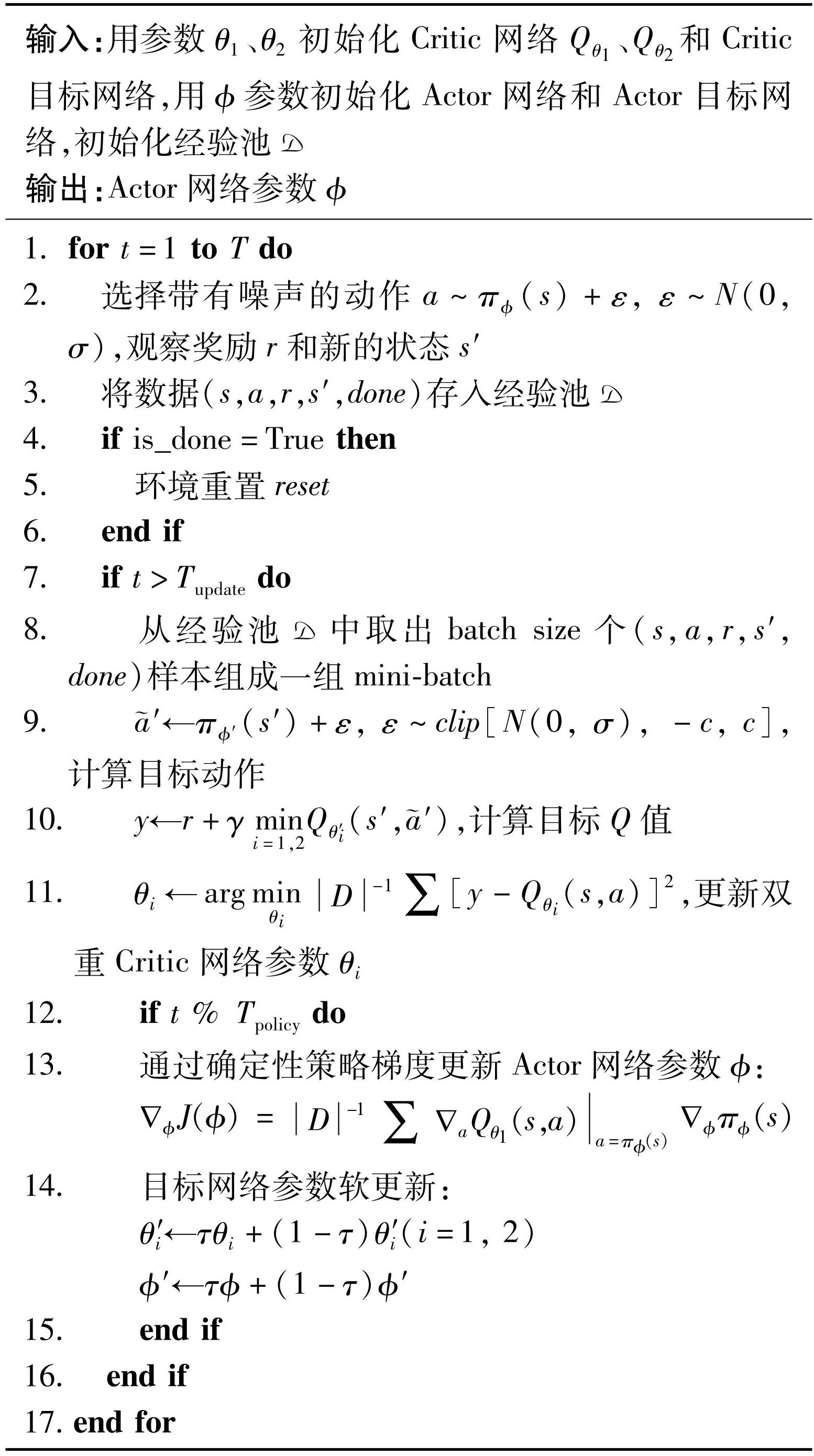 智能体基于TD3算法更新过程进行训练。训练过程通过在经验池(replay buffer)中采样批次(batch size)数据,对各网络进行更新。除采用上文提到的3个关键技术外,Actor网络通过最大化累积期望奖励进行更新(确定性策略梯度),任选双重Critic网络之一计算Q值,动作不施加噪声,本文选定为双重Critic网络中的第1个Critic网络;双重Critic网络均通过最小化目标估值的时间差分误差(temporal difference error,TD-error)逼近贝尔曼方程进行更新;Actor和Critic目标网络均通过软更新方式进行更新。智能体基于TD3算法整体训练流程如算法1[17]所示。