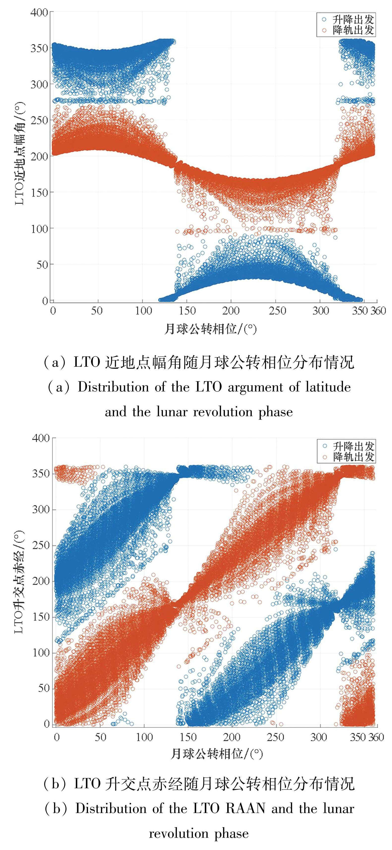 TLI纬度幅角uTLI在[-90°,90°]内进行地月转移时为近地升轨出发方式;反之为近地降轨出发方式。不同升降轨方式之间的轨道演化特性及非线性特征存在差异[19]。将近地出发高度hTLI设为170 km,近月点轨道高度范围约束[hlbPRL,hubPRL]设为[120.5 km, 119.5 km]。瞄准再入点轨道高度122 km与倾角-6°,并将再入点条件等效于真空近地点轨道高度约束,即设为51 km左右[26]。在高精度模型下对tTLI、iLTO和iRTO进行修正遍历,得到FRO解空间的分布情况,结果如图2所示。由于时间主要相关的地月空间几何特征为月球绕地球公转的纬度幅角,简称月球公转相位,下面采用tTLI时刻的月球公转相位来表示时间特征。其中,标蓝解集表示近地升轨出发进行地月转移的轨道解子空间;标红解集表示近地降轨出发进行地月转移的轨道解子空间。由于uTLI与ωLTO满足式(2)关系,近地升降轨方式与ωLTO直接相关,在图2(a)区分度明显,呈多个连续弧形集中分布特征。图2(b)中不同升降轨方式的解集集中分布于近似平行的不同非交叠斜带中,分域特性同样明显。