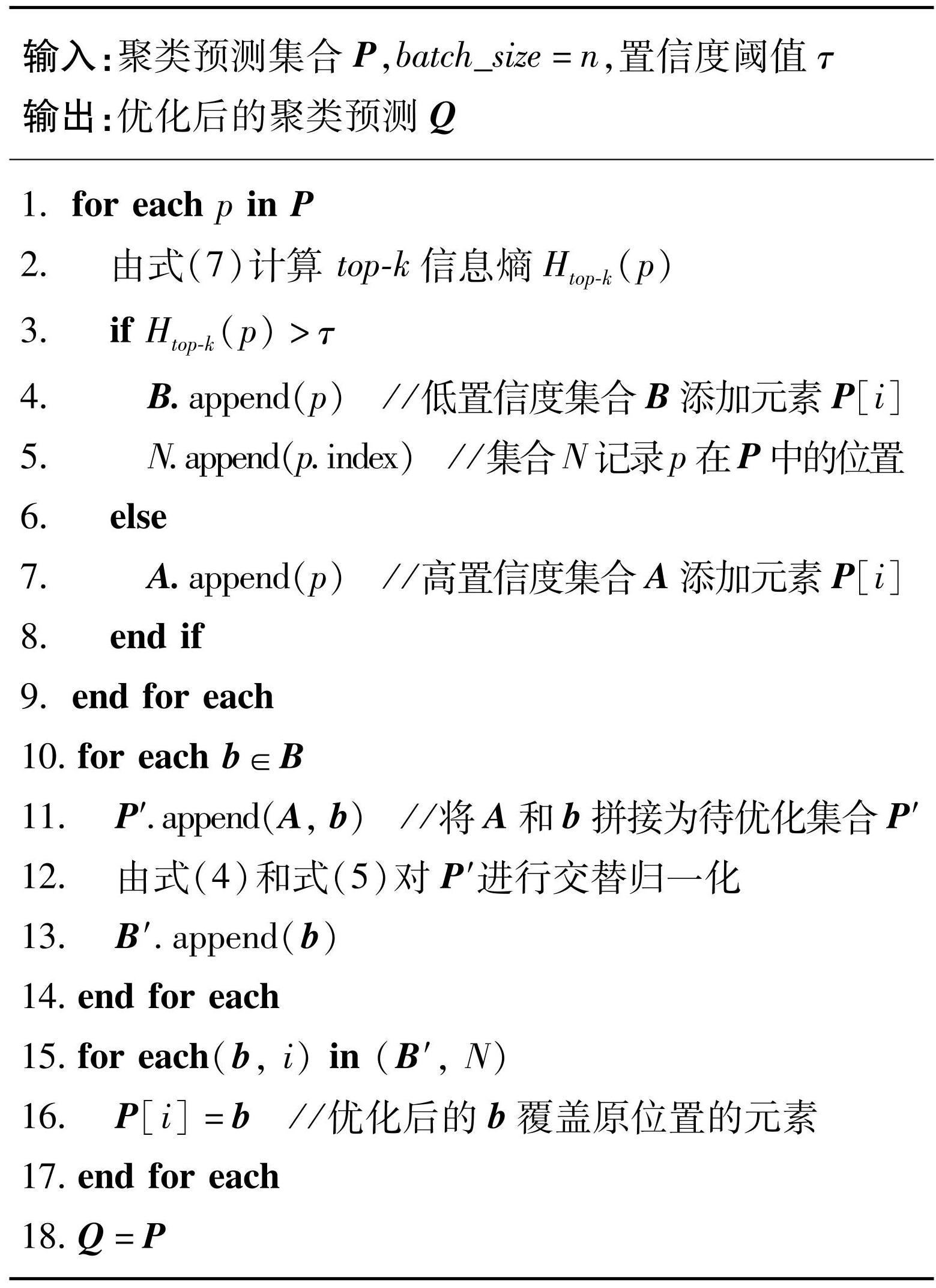通过对低置信度预测集中的每一个待优化预测b按1.2.2节方法进行校正,可优化该批样本中所有低置信度预测从而得到,替换P中对应位置的b,而高置信度预测则无须调整,即可得到该批样本优化后的聚类预测。算法1给出了低置信度聚类预测优化的伪代码。
