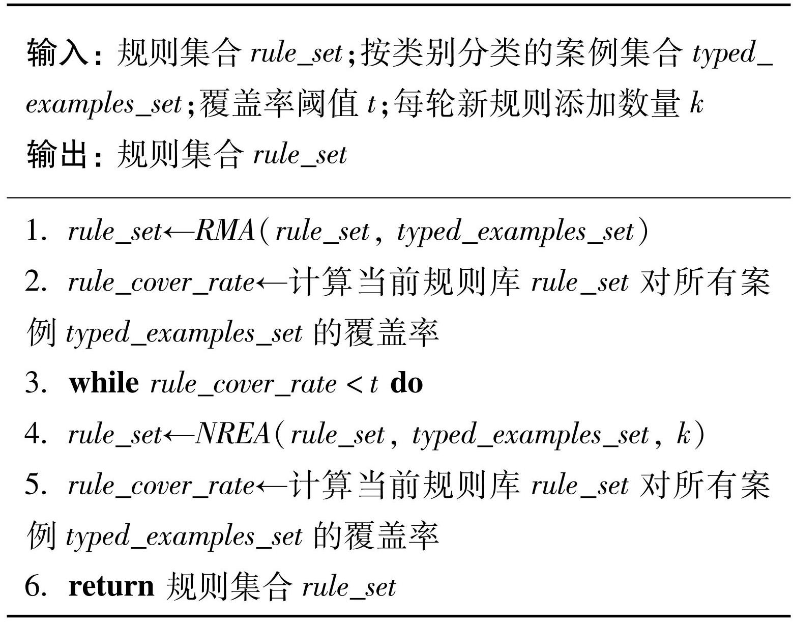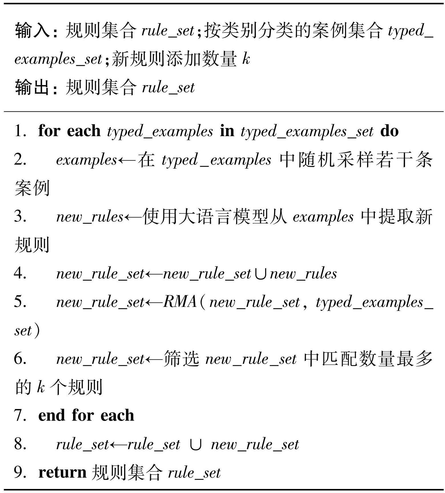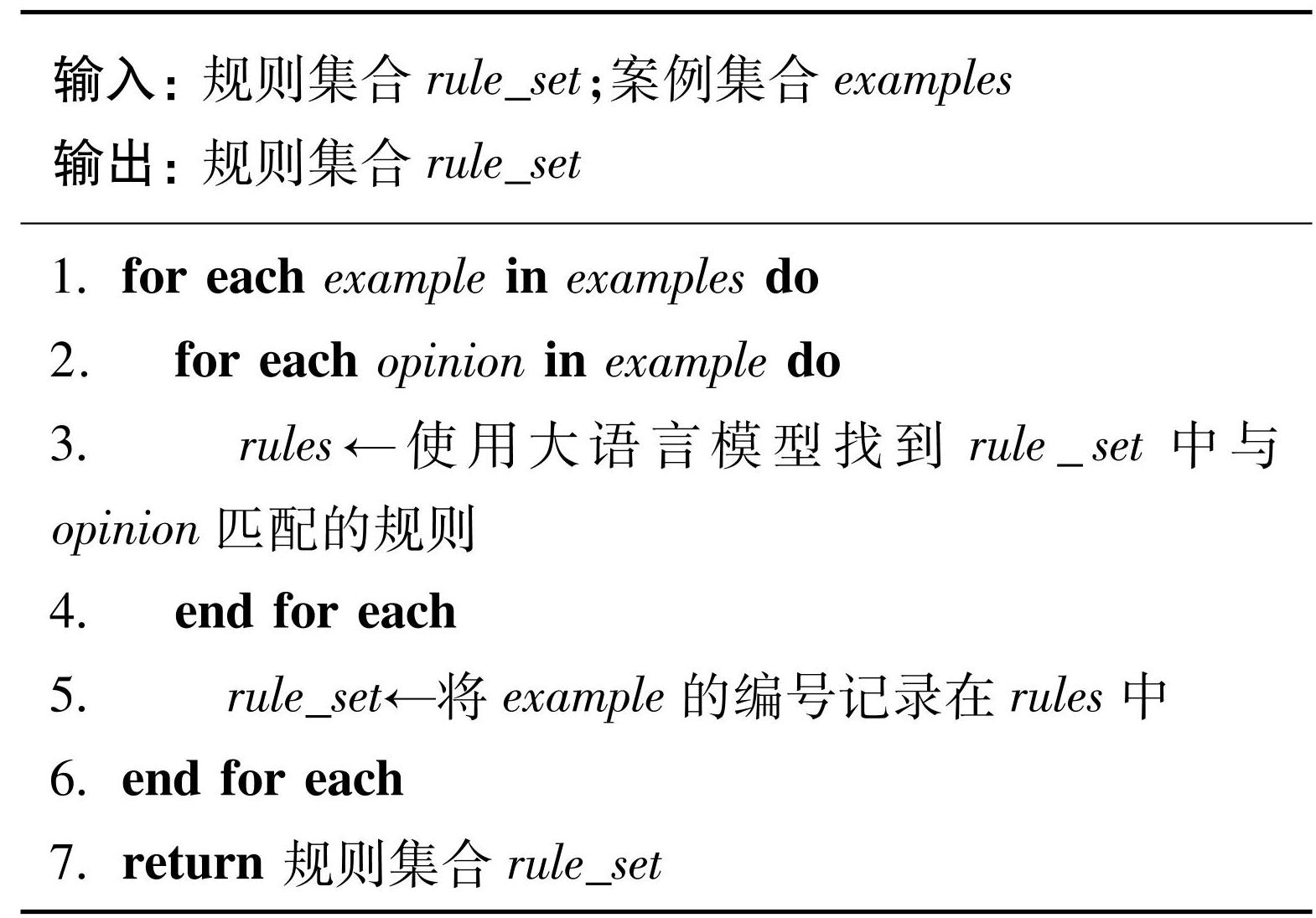 为提高大语言模型生成电网法律文书中答辩观点的精度和准确性,提出了一种基于大语言模型的自动化规则扩充方法。该方法通过从训练数据中自动抽取答辩规则,并利用这些规则引导大语言模型生成符合法律逻辑和实践经验的答辩观点。本任务中每一条规则均源于诉讼文书与对应答辩观点的组合。规则通过分析文书和观点之间的逻辑关系与法律依据提取而来,为大语言模型提供生成过程中法律框架和观点指导。如算法1所示,自动规则抽取方法包括规则匹配(见算法2)和规则生成(见算法3),均基于大语言模型的上下文学习能力。其中算法2中的规则匹配算法通过为大语言模型提供规则与(诉讼书、答辩观点)匹配的样例,使其判断每个答辩观点是否符合规则库中的某条规则,该步骤具体输出为观点编号及其对应的规则编号。此时模型会保存与每条规则匹配的诉讼书和答辩观点数量,即规则的匹配度。当答辩观点未命中规则库中的规则时,模型将调用规则生成算法根据规则库中的规则形式生成新的规则。通过从多个样例中抽取信息,模型能够总结出新的规则,进一步扩充规则库,具体操作见算法3。每轮迭代中生成的新规则会通过规则匹配算法进行验证,并将匹配度高的k条规则保留在规则库中。需要注意的是,一个案例(具有一个或多个观点)可能匹配多条规则,覆盖率t指所有案例中与至少一条规则匹配的案例数量占总案例数量的比例。规则匹配覆盖率在规则匹配算法遍历整个案例数据集后计算(算法1的步骤5)。当覆盖率大于等于预定阈值t时算法结束循环(本文该阈值设置为0.7)。上述算法中使用的通用大语言模型为ChatGPT,但不限于ChatGPT。