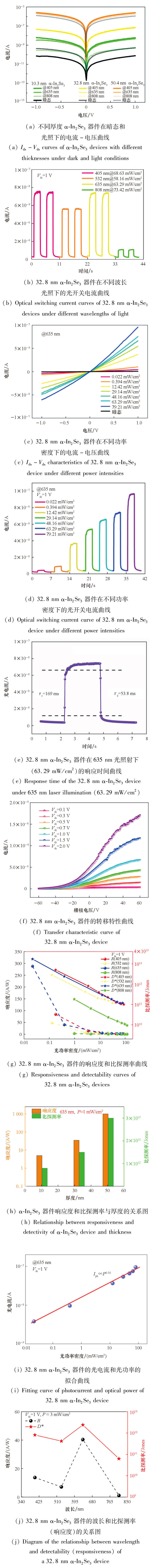 图3(j)提供了波长和比探测率(响应度)的关系图,直观地表达了本实验制备的32.8 nmα-In2Se3这种厚度的器件对波长为400~808 nm范围内的探测性能情况,其中在同一光功率密度P≈3 mW/cm2下635 nm处的响应度和比探测率最优,而在靠近800 nm左右的近红外区域性能下降明显。这种有效的调制和光电性能的改进表明可以尝试通过改变其厚度的能带工程来设计和优化基于二维α-In2Se3材料制作出的光电探测器的探测性能。