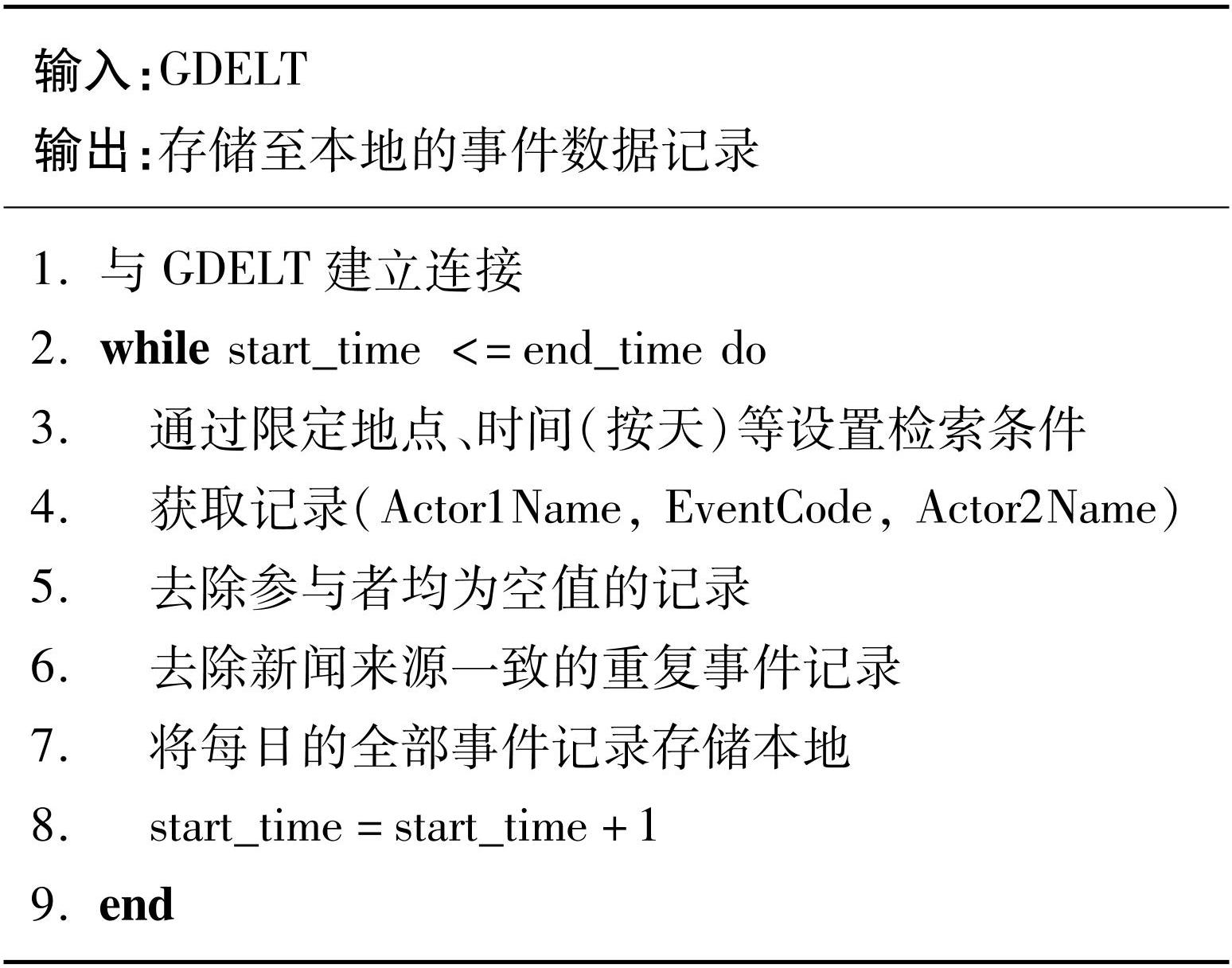考虑到数据的权威性,选取维基百科中明确记录且在全球主流媒体曾广泛报道、关注度高的事件词条,并适当扩展时间范围,通过限定地理位置、时间等检索条件从GDELT中获取数据至本地,具体如算法1所示。