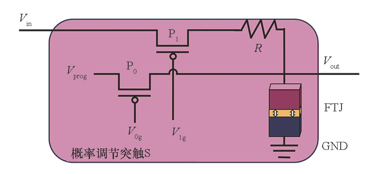 图8展示了基于FTJ的概率调节突触结构。突触有编程模式和写驱动模式。在编程模式下,当晶体管P0的栅极信号V0g置为低电平时,晶体管开启,从而允许编程电压Vprog被施加到FTJ上。Vin表示概率调节突触输入电压。在写驱动模式下,当晶体管P1的栅极信号V1g置为低电平时,晶体管开启,输出电压Vout根据当前FTJ的电阻值RFTJ进行调节,如式(7)所示。