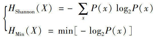 器件工艺偏差已经由MC仿真引入,因此这里进一步考虑电压和温度偏差。本节TRNG翻转概率也固定在50%。输出比特序列统计随机性引入输出熵量化。对于任意离散随机变量X,其香农熵HShannon由式(10)定义。对于每个比特,它有两个状态“0”和“1”,当其分布概率各为50%时,香农熵的最大值为“1”。同样地,对于这样的X,其最小熵HMin由式(10)定义,描述最坏情况下的序列随机性。它的范围也在[0,log2m]之间,其中mX可能出现的状态数目。
