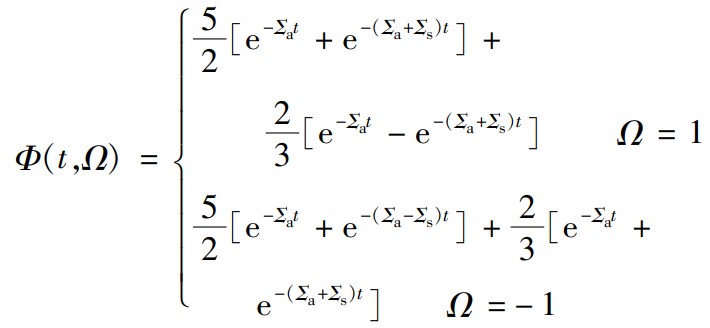 考虑一个粒子角通量密度问题,粒子状态只依赖于方向Ω而不依赖于空间,即方程(1)只考虑散射和吸收项的形式。假设一个粒子,它有两个方向状态: Ω=1和Ω=-1,粒子可以发生散射,即按泊松过程均匀地选择一个新的方向,也可以按照第二泊松过程被吸收,粒子发生散射和吸收事件的速率分别由常数ΣaΣs控制。设定v=1,散射后,粒子从状态i变为状态j的概率Pij=1/2。粒子群的角通量密度服从玻耳兹曼输运方程: