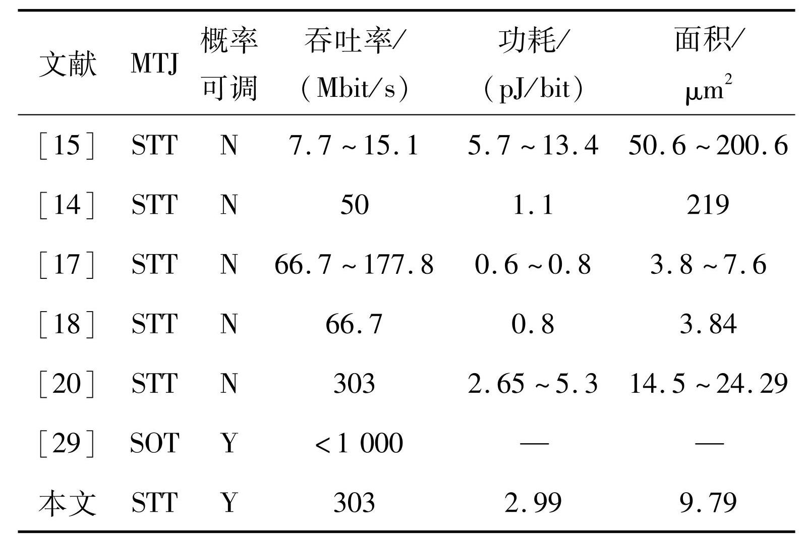 性能方面。考虑一次随机比特生成时间,所设计概率可调TRNG跟踪操作的执行时间由设计周期决定,包含0.4 ns读取操作和1 ns概率写操作。在通用CPU上通过软件生成随机序列,随机数生成方法分别采用random库的random,os库的urandom以及secrets库的randbelow三种方法,平均时间分别为0.24 μs、0.49 μs和1.44 μs。因此TRNG相比CPU上的软件实现,性能提升约171~1 028倍。需要说明的是,具有3 584 CUDA核的GPU求解输运问题相较CPU仅获得55.6倍的加速比[28],因而CPU作为比较基准,代表具有最高串行性能的通用处理器。相较非冯·诺依曼架构,神经形态处理器TrueNorth的单次输运跟踪时间为484 μs[8],远低于具有物理随机性的自旋硬件方法。