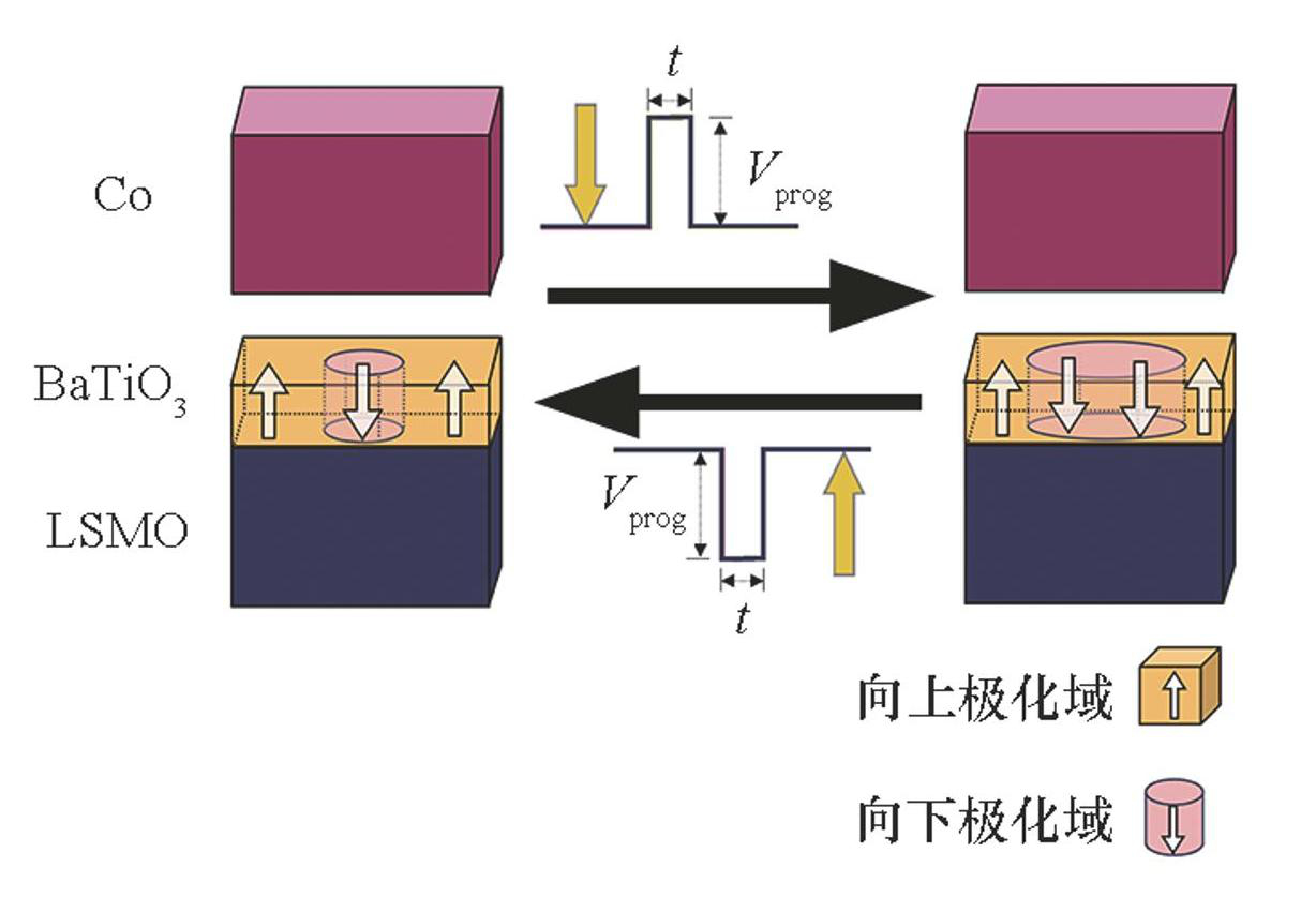最近的研究在FTJ中发现了忆阻行为,铁电极化翻转可以引起电阻的连续变化[24]。典型的FTJ结构由两个电极层和它们之间的超薄铁电势垒层组成,如图3中由Co、BaTiO3(BTO)、LSMO组成的FTJ。施加电压可以诱导BTO铁电层的极化翻转,改变电子的隧穿概率,从而导致电阻发生变化。在完全向上极化的铁电薄膜中,施加正向编程电压会引发向下极化畴的成核和拓展,进而导致连续的电阻变化,即图3中从左向右的过程。反向电压则驱动向上极化畴的成核与拓展。利用FTJ的忆阻特性,可以将其编程到稳定阻值,从而实现非易失且连续编码TRNG写入电压,以实现TRNG输出概率可调。需要说明的是,极化阻值可能受到温度以及势垒层尺寸等参数影响,但本文重点考虑自旋切换过程,因此通过对MTJ引入电压偏差来考虑FTJ工艺偏差。