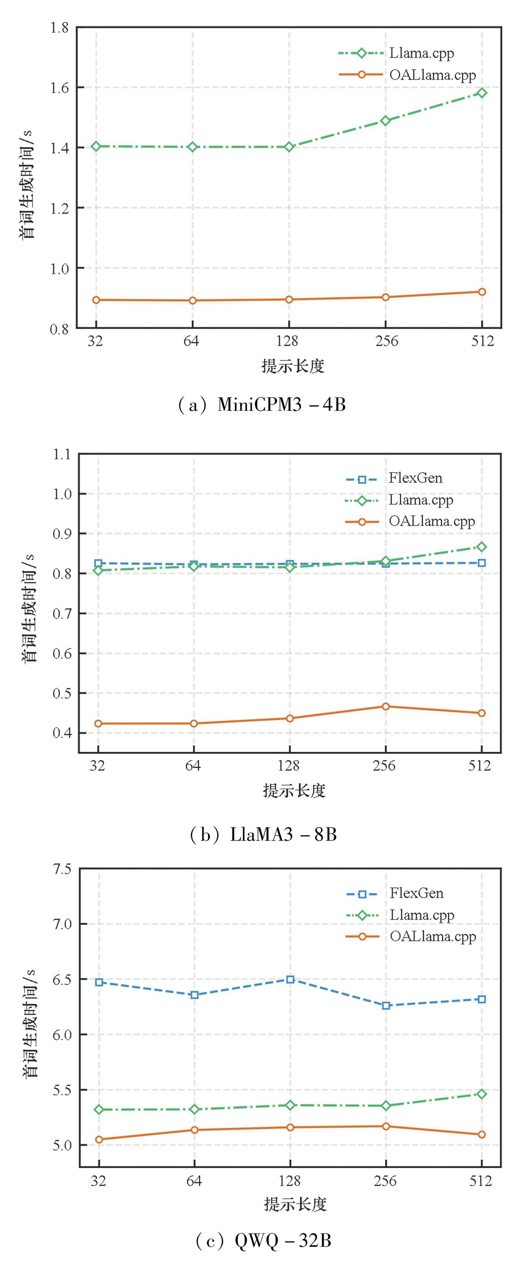 为了研究预填充阶段OALlama.cpp的性能表现,对不同场景中模型推理的首词生成时间(time to first token,TTFT)进行了实验,以MiniCPM3-4B、LlaMA3-8B和QWQ-32B模型为研究对象,收集首词生成时间,对FlexGen、OALlama.cpp和Llama.cpp的推理效果进行对比分析,此外,由于本实验场景GPU内存大于MiniCPM3-4B和LlaMA3-8B模型的需求,为了模拟资源受限场景,分别设置加载25%的MiniCPM3-4B模型和75%的LlaMA3-8B模型。