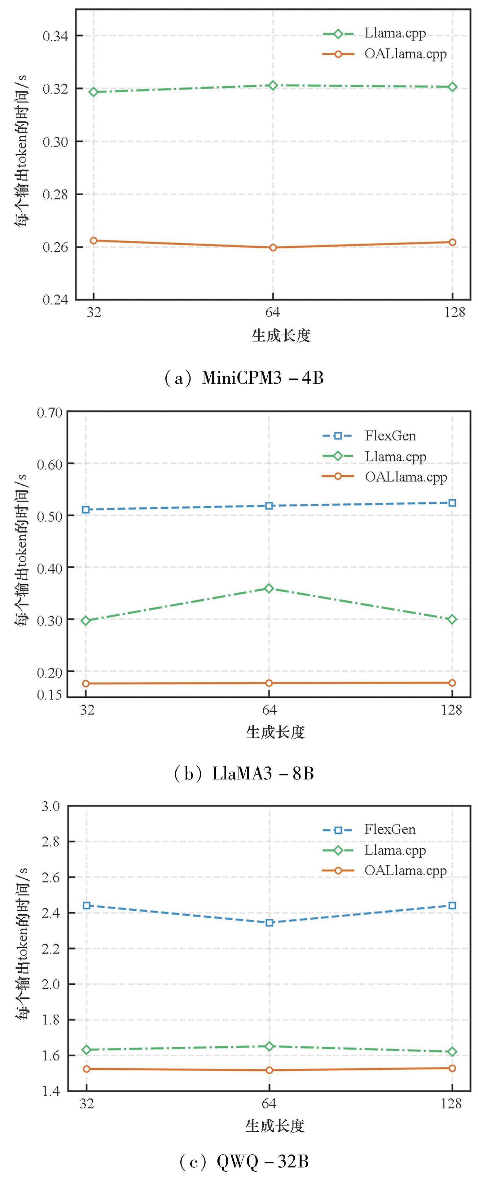 为了研究解码阶段OALlama.cpp的性能表现,对不同场景中模型推理的每个输出token的时间(time per output token,TPOT)进行了实验。以MiniCPM3-4B、LlaMA3-8B和QWQ-32B 模型为研究对象,收集每个输出token的时间,对FlexGen、OALlama.cpp和Llama.cpp的推理效果进行对比分析,实验结果如图9所示。