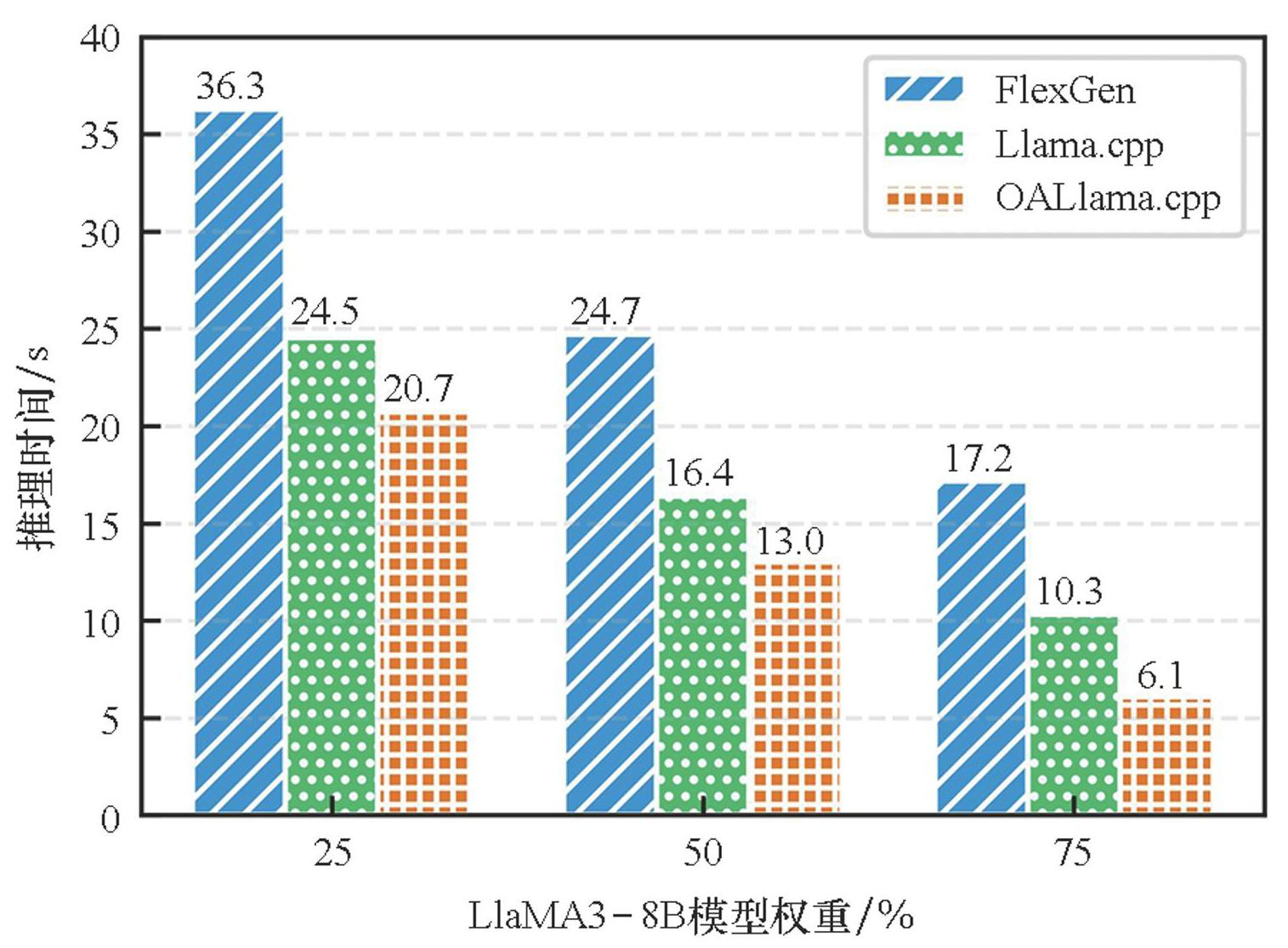 为了研究不同资源受限情况下OALlama.cpp的表现,将LlaMA3-8B模型权重加载至GPU的比例分别设定为25%、50%和75%。实验结果如图10所示,随着权重比例从25%提升到75%,OALlama.cpp的推理时间均显著低于FlexGen和Llama.cpp。在25%权重比例时,OALlama.cpp较FlexGen快了约43%,较Llama.cpp快了约15.5%;当权重比例提升到50%时,OALlama.cpp较FlexGen的提效幅度达到约47.4%,较Llama.cpp快约20.7%;到75%权重比例时,OALlama.cpp较FlexGen提效高达约64.5%,较Llama.cpp提效约40.8%,优势越发明显。这是由于随着权重比例的增加,OALlama.cpp能够将更多GPU亲和度更高的算子卸载到GPU上计算,从而实现更优的效果。