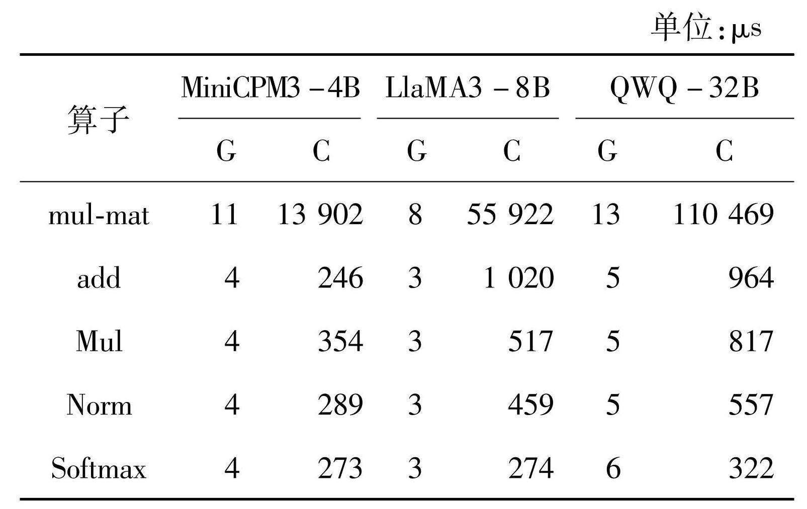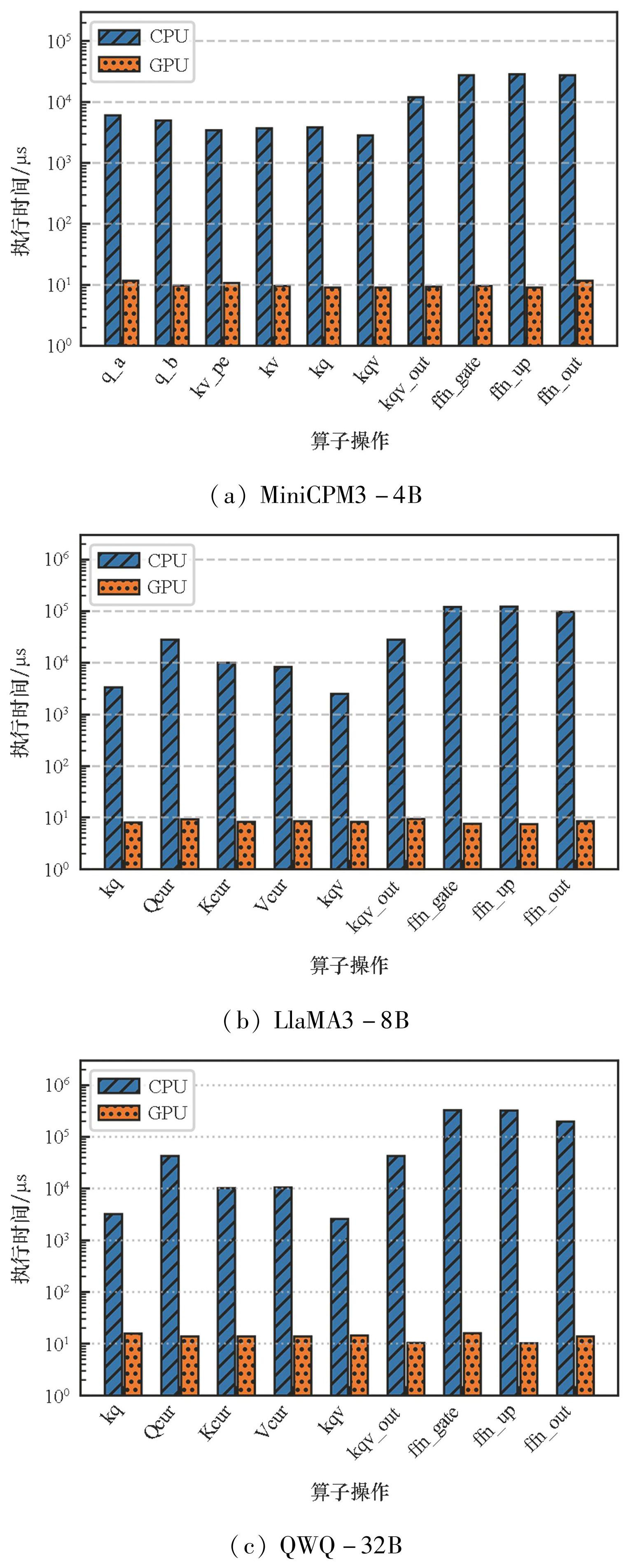 为深入剖析mul-mat算子的性能特性,对其内部不同矩阵乘法算子操作进行了细致拆解与分析。如图2所示,该图清晰呈现了CPU与GPU设备上不同mul-mat算子操作的延迟表现差异。数据显示,MiniCPM3-4B、LlaMA3-8B和QWQ-32B模型的mul-mat算子在GPU平台的执行延迟分别约为11 μs、8 μs和13 μs,且各算子间波动范围极小,体现出GPU计算资源的高效与稳定;反观CPU平台,不同mul-mat算子的延迟表现呈现显著分化,在MiniCPM3-4B、LlaMA3-8B和QWQ-32B模型中,其数值区间跨度分别为2 822.23 μs至28 676.96 μs、2 510.11 μs至122 479.01 μs和2 574.95 μs至327 259.25 μs。这一结果充分表明,将不同mul-mat算子从CPU迁移至GPU时,所带来的性能增益存在显著差异。