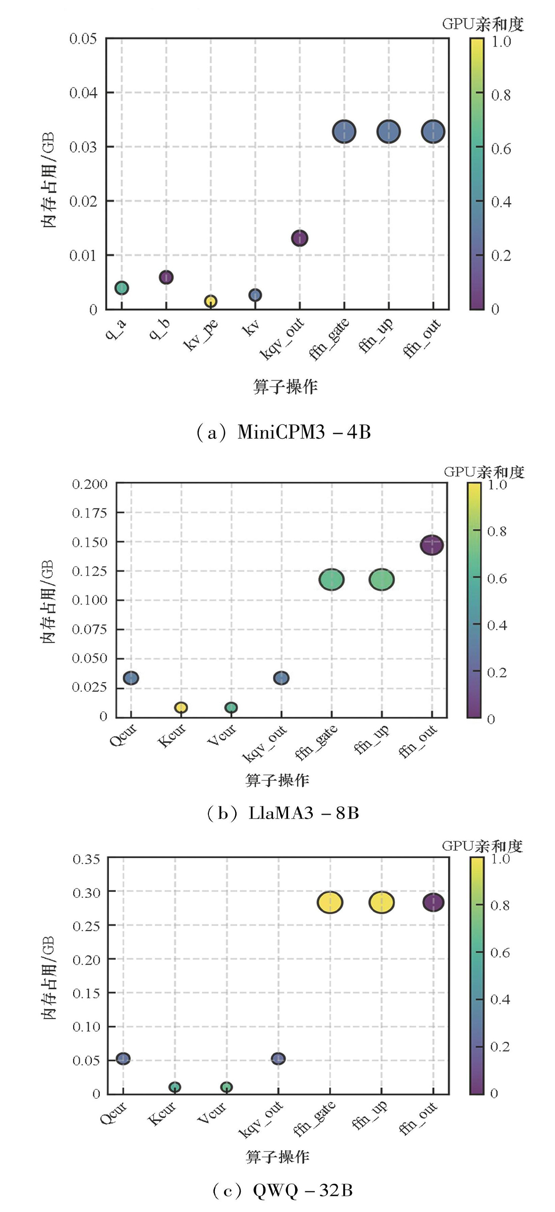 图3分别展示了在MiniCPM3-4B、LlaMA3-8B和QWQ-32B三个模型架构下,不同mul-mat算子操作的内存占用、时间加速、GPU亲和度等特征,其中圆圈大小表示算子在CPU和GPU设备上的运行延迟的差值,圆圈越大说明算子延迟差距越大;圆圈的颜色表示GPU亲和度,颜色越浅说明算子GPU亲和度越高。从图中可以明显看出,无论哪个模型,算子的GPU亲和度都呈现显著差异。这一发现为算子卸载策略的制定提供了重要依据。以图3(a)为例,将q_a算子操作和q_b算子操作进行比较,前者的GPU亲和度为0.4,而后者仅为0.1。这表明在内存资源受限的场景中,优先将q_a算子操作卸载至GPU执行,能够相较于将q_b算子操作卸载至GPU执行实现更为显著的推理加速效果。该结论对于优化计算资源分配、提升模型推理效率具有重要的实践指导意义。