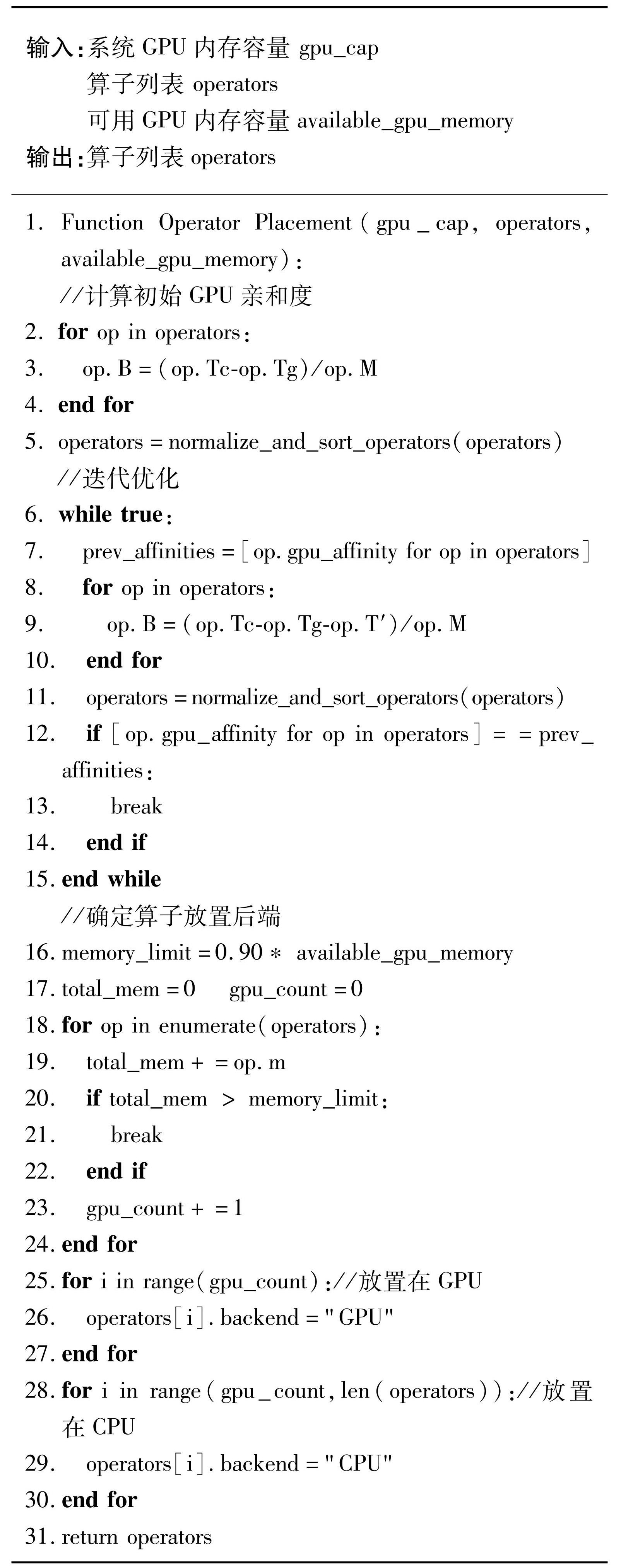 算法总述:为了生成最优的放置方案,它会迭代式地为算子的GPU亲和度排序,直到找出算子最佳的GPU亲和度序列。该算法在整个搜索过程中主要跟踪算子是否存在CPU和GPU之间的数据传递。在算法的每次迭代中,它会相应地更新算子的GPU亲和度。