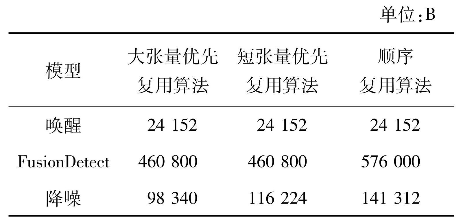 图5展示了三个控制流模型在执行支持控制流的复用优化策略后的内存峰值占用情况与传统的算法对比。图5(a)为FusionDetect模型优化效果,图5(b)为降噪模型优化效果,从图中可以看到,该策略在这两个模型内均进一步降低了峰值内存占用量,最高优化效率达到5.9%。由于唤醒网络中不同分支之间内存差距过大,即使与另一个分支进行复用,复用的内存区域未能有效地减少原有分支的内存需求,因此未能实现优化。