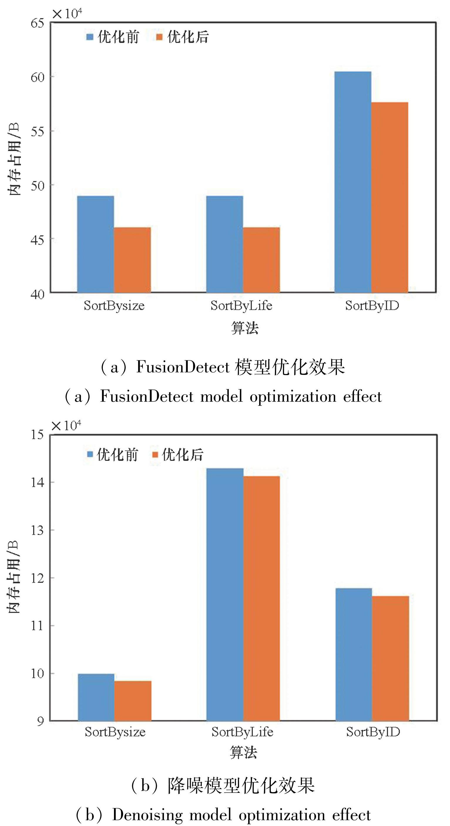 图6展示了FusionDetect模型在优化前后的内存分配,展示了该模型所有张量。图6(a)为使用大张量优先复用策略后内存空间的分布图,两个分支内的张量之间的生命周期重叠后无法进行内存复用,内存分配较为分散。支持控制流的优化策略将两个分支的内存复用后分配一块大内存供两个分支内的节点使用,将两个分支的张量合并后,使用了绿色的内存块表示两个分支张量使用的内存空间,且峰值内存有所下降,如图6(b)所示。