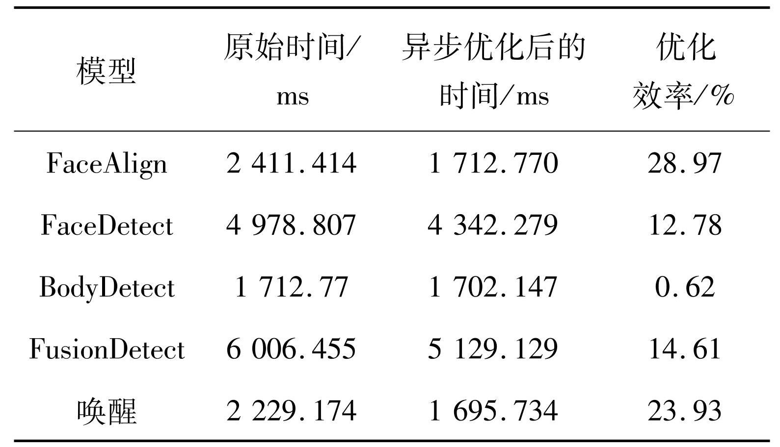 本节基于不同的模型在执行时的计算效率,对DMA异步传输优化进行评估,该方法实现了在含控制流的模型中的DMA异步传输,将使用该方法后模型的计算效率与同步进行数据传输和计算的模型计算效率进行比较,结果如表3所示。使用该方法后,模型的执行效率均得到了不同程度的提升,尤其在FaceAlign和唤醒模型中优化效果较为显著。其主要原因在于这两个模型中算子尺寸较大,在插入DMA传输后显著节省了内存传输开销,最高可节省约29%的时间。