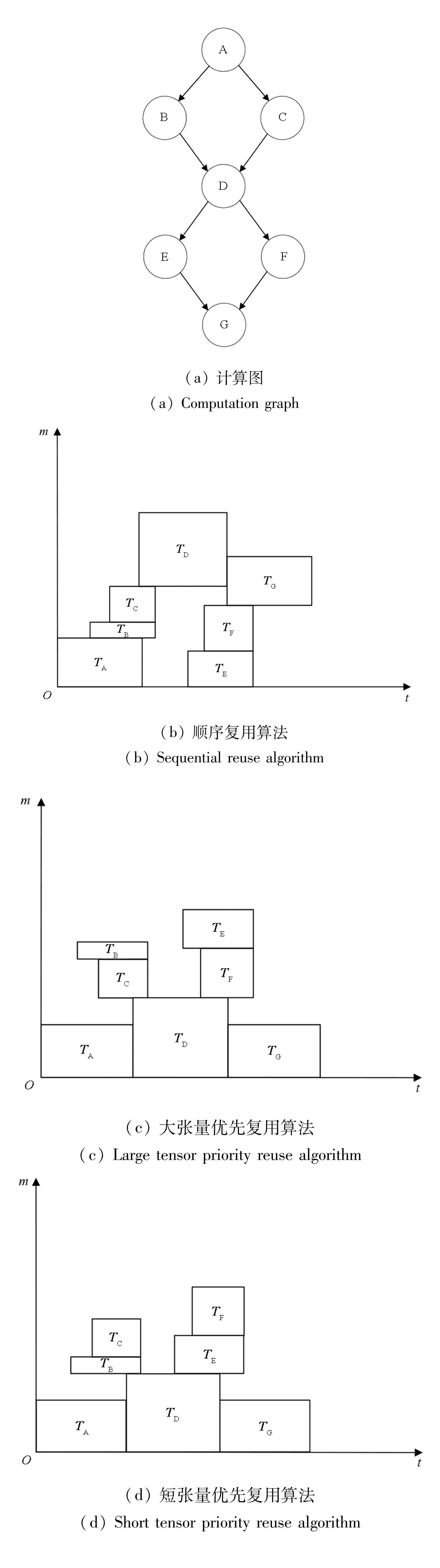 考虑无控制流的深度学习模型的内存复用策略。在一个计算图中存在大量算子产生的张量时,这些张量占用的内存空间的复用情况较为复杂,按一定的方式对张量进行排序可以提高内存复用的效果,提前为一部分张量分配内存空间,后续张量在与已分配内存空间的张量不冲突的情况下复用后者的内存空间。对这些算子采用不同的复用策略会达到不同的优化效果,如顺序复用算法、大张量优先复用算法[14]以及短张量优先复用算法[24],如图1所示。本文对三种内存复用算法进行介绍并提出改进思路。