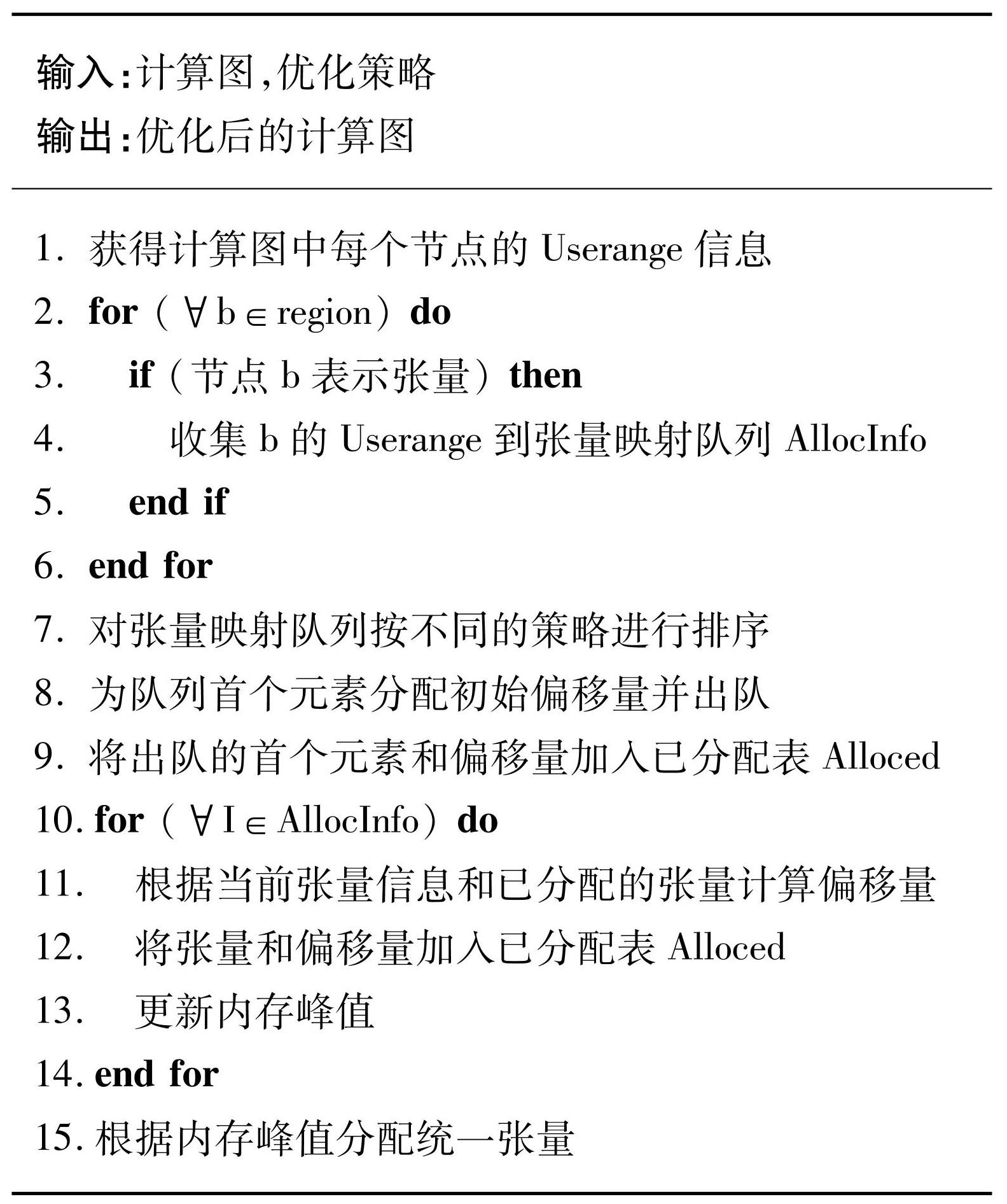 在计算图中,需要遍历节点以收集张量信息。算法1实现了在计算图上的内存复用,首先初始化张量映射队列,该数据结构内收集了张量的大小,首次使用位置和最后一次使用的位置,通过这些可以获取生命周期以及后续分配时的空间大小。在第1行获得图内算子的定义-使用链,通过该结构获得每个算子的输出被使用的位置,以此获取张量的生命信息。在第4行收集每个张量的具体信息并存放在张量映射表内,之后将每个映射表入队。随后,在第7行对收集到的张量按输入的优化策略进行排序。排序完成后,为队列内首个元素,即映射表内的张量分配初始偏移量(一般为0)作为缓冲区空间的起始地址,分配结束后出队,并加到已分配张量的集合内,视为该张量在片上内存的分配缓冲区。后续将遍历未分配的张量队列,计算偏移量,即获得缓冲区的位置。依次检查每个张量的生命周期是否与已分配张量发生冲突。如果没有冲突,则按当前的起始地址为该张量分配内存空间,否则起始地址从低到高偏移直到生命周期不重叠。获取偏移量的同时计算内存占用峰值大小并更新。后续将根据峰值大小建立一整块连续的内存空间供所有张量使用。