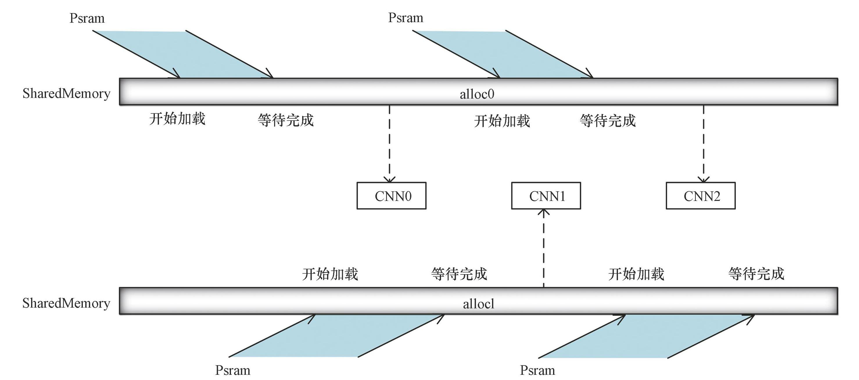 在无控制流的模型中,算子通过DAG的拓扑排序顺序执行,在节点计算前,从大容量低速外部内存(Psram)中使用DMA传输数据到DMA内存alloc0,等待数据传输结束后,在节点CNN0开始读取alloc0中的数据进行计算前,启动DMA从片外内存将下一个节点CNN1所需的数据传输到另一个DMA内存alloc1,后续交错执行该步骤。因此在DAG中顺序执行节点的过程中,序号为偶数的节点使用DMA内存alloc0,序号为奇数的节点使用DMA内存alloc1。