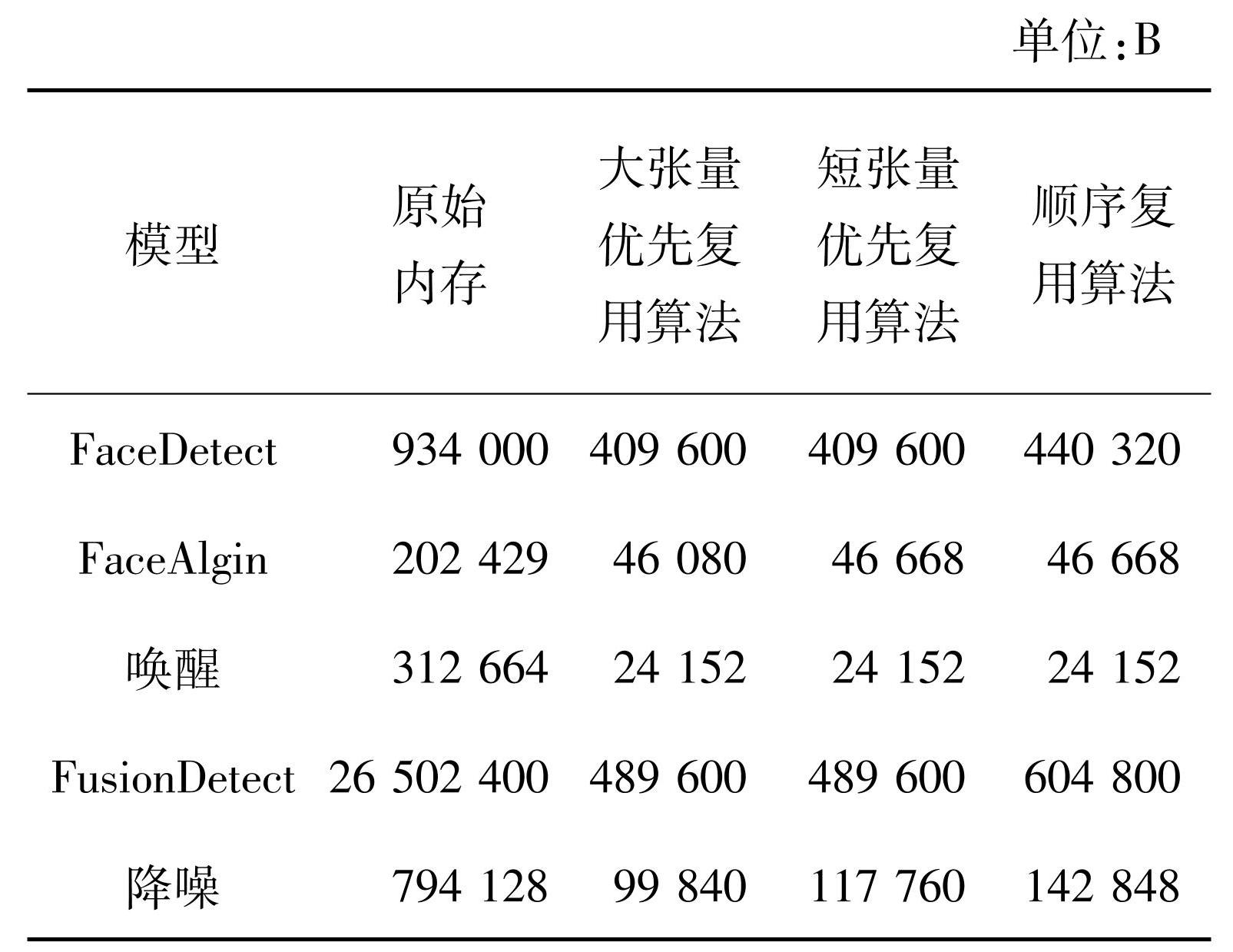 本节通过模型编译过程中最终使用的峰值内存评估了管理中间张量的三种算法——大张量优先复用算法、短张量优先复用算法、顺序复用算法,并对比了其控制流优化算法的效果,对比结果见表1、表2。Naive分配所有必需的内存,并且仅作为比较的基线。FaceAlgin、FaceDetect是不包含控制流的神经网络模型。FusionDetect是将BodyDetect和FaceDetect裁剪后组合的模型,用于测试算法优化效果。FusionDetect、唤醒和降噪模型为包含控制流的神经网络模型。