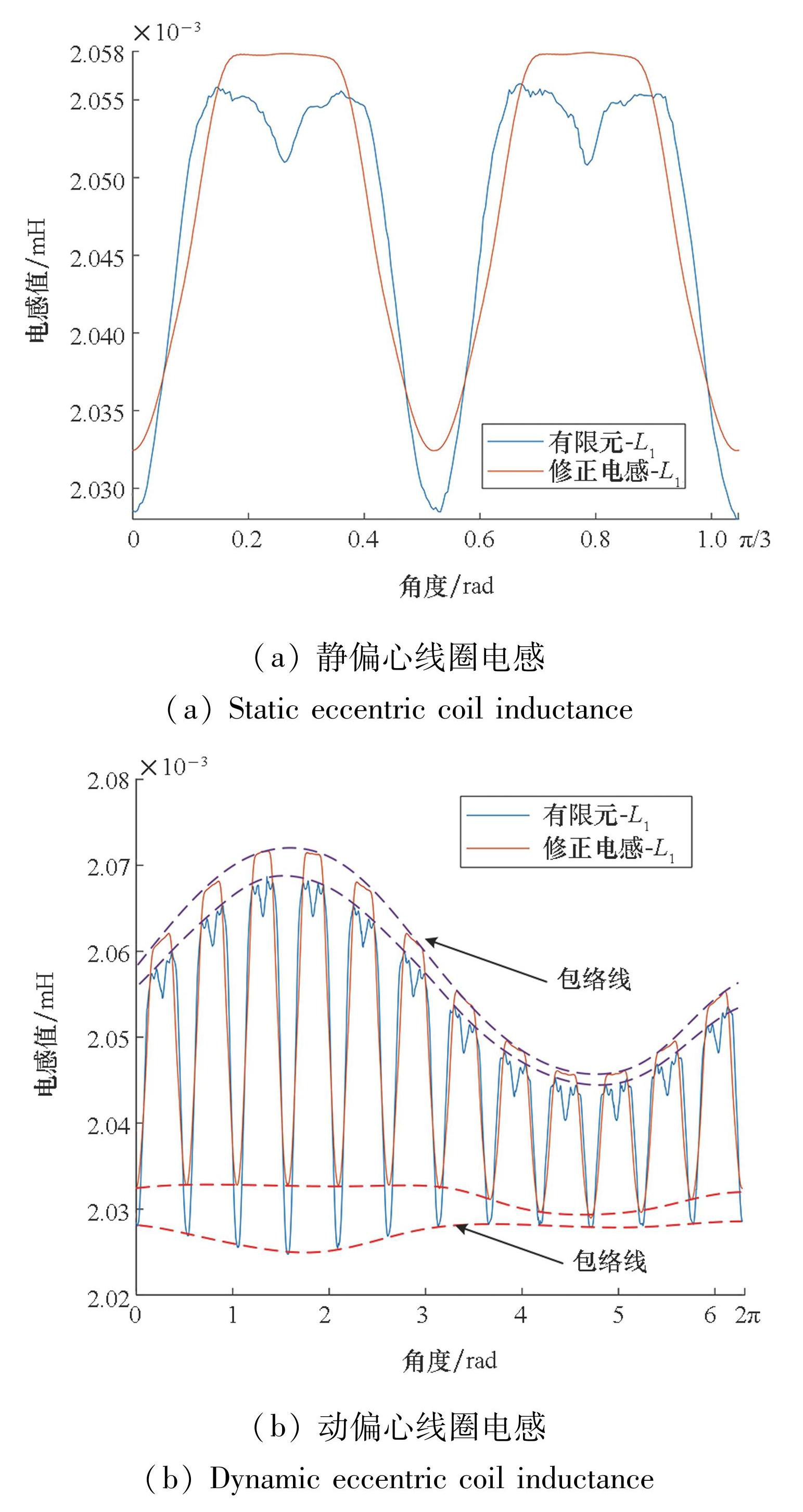 从图10可以看出修正后的计算电感值与有限元仿真得到的电感值相比无论是上包络还是下包络都能较好地吻合,计算精度得到进一步提高。