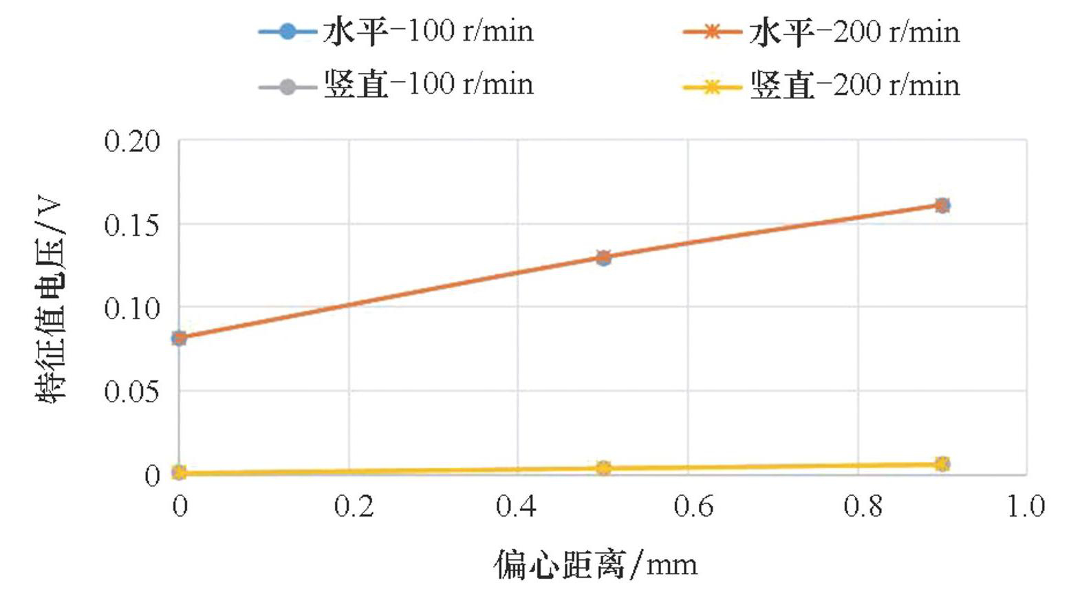 分别在100 r/min和200 r/min空载两种工况下开展不同偏心度的静偏心模拟实验,得到水平和竖直两个方向的特征值电压如图11所示。
