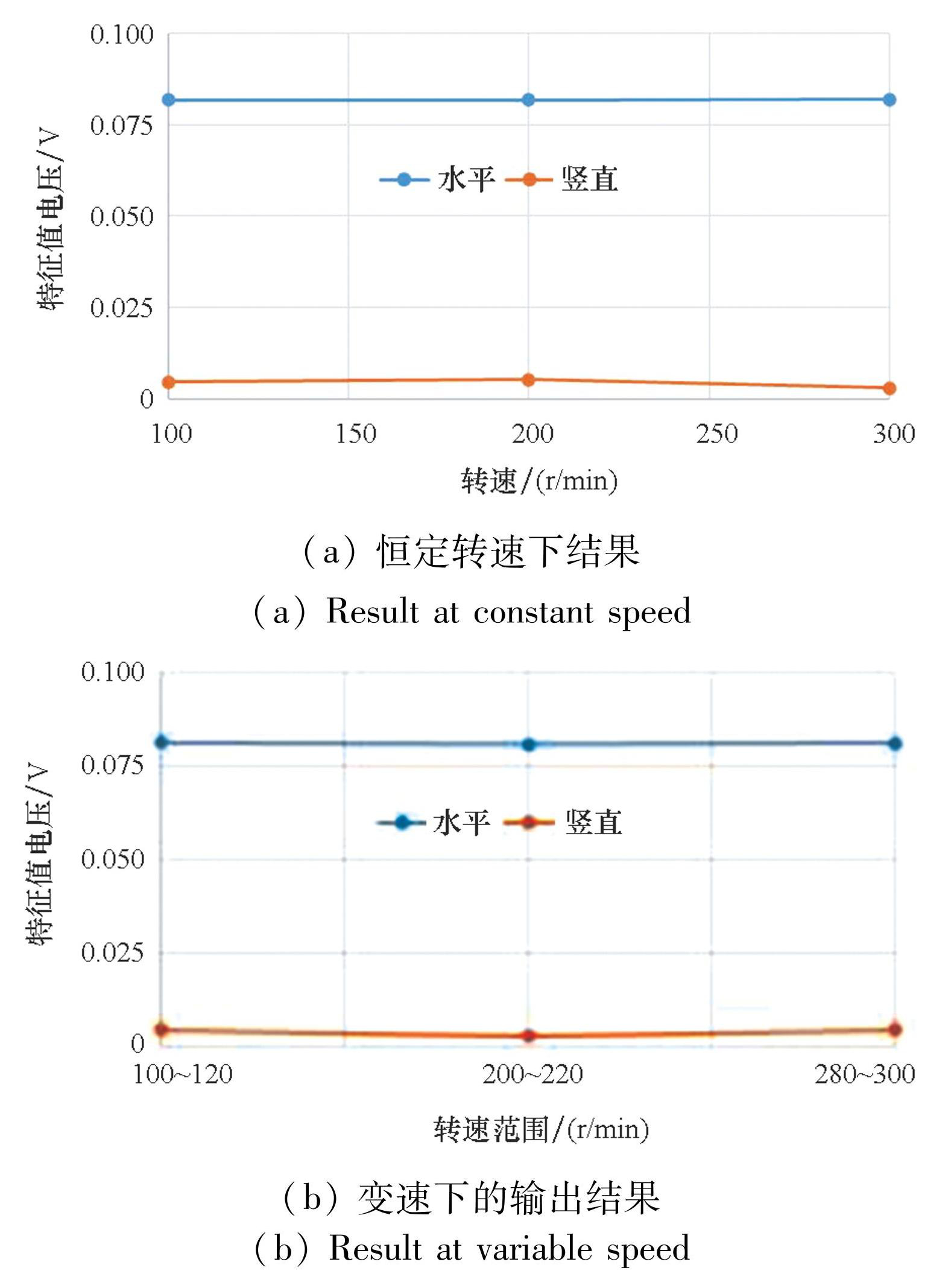 图11的实验结果表明差分电路输出特征值与故障程度成正比,且检测结果不受转速影响,为了进一步验证检测方案对转速的鲁棒性,在相同转子偏心度下,分别在100 r/min、200 r/min以及300 r/min下开展实验,结果如图12(a)所示,在变速运行时的实验结果如图12(b)所示,可见,不论是恒速运行下的检测结果还是变速运行下的检测结果均保持一致。