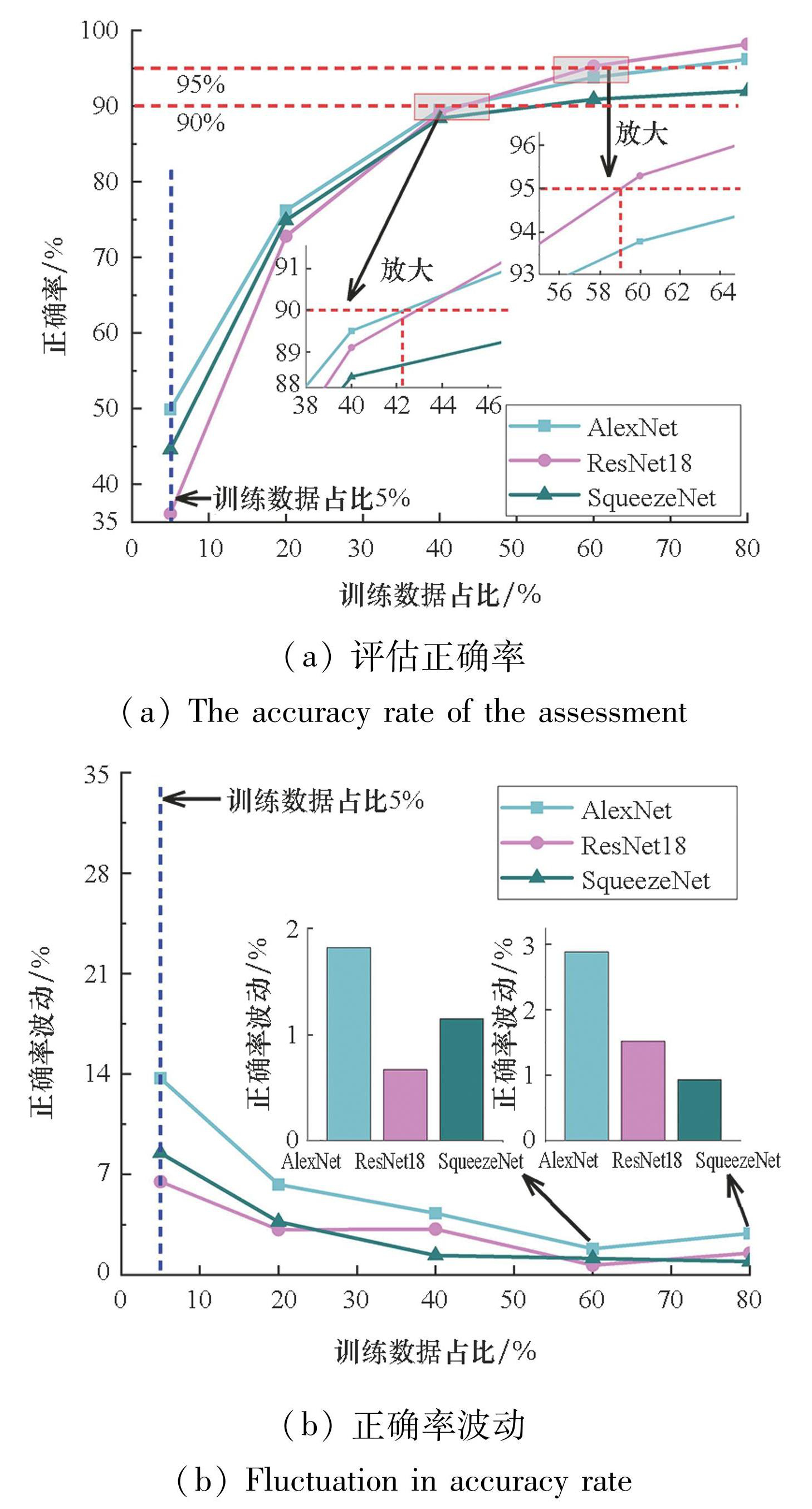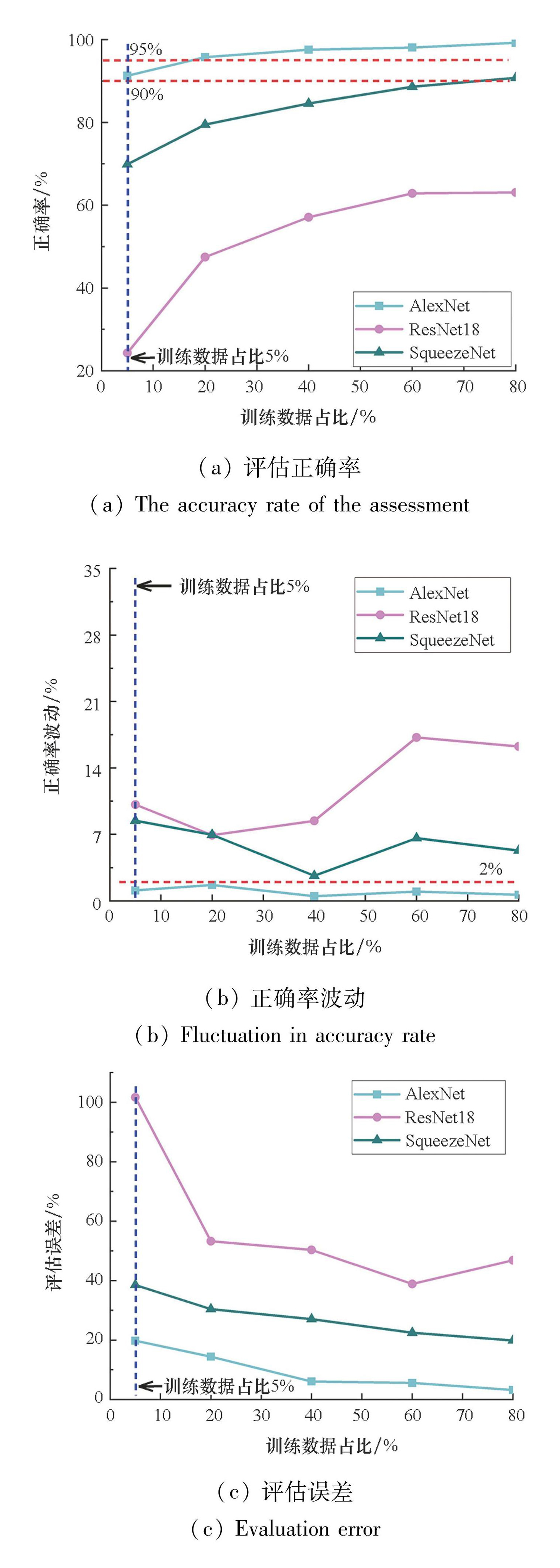 如图20(a)所示,随着训练数据占比的增加,三种卷积神经网络的评估正确率均提高。AlexNet在所有训练数据占比下的评估正确率均远高于ResNet18和SqueezeNet。当训练数据占比为5%时,AlexNet的评估正确率超过90%,达到91.2%。当训练数据占比为80%时,AlexNet的评估正确率为99.23%。SqueezeNet的评估正确率达到90%时其训练数据占比约为70%,ResNet18在训练数据占比为80%时的评估正确率仅为63%,可以看出两者的评估性能较AlexNet有较大差距。