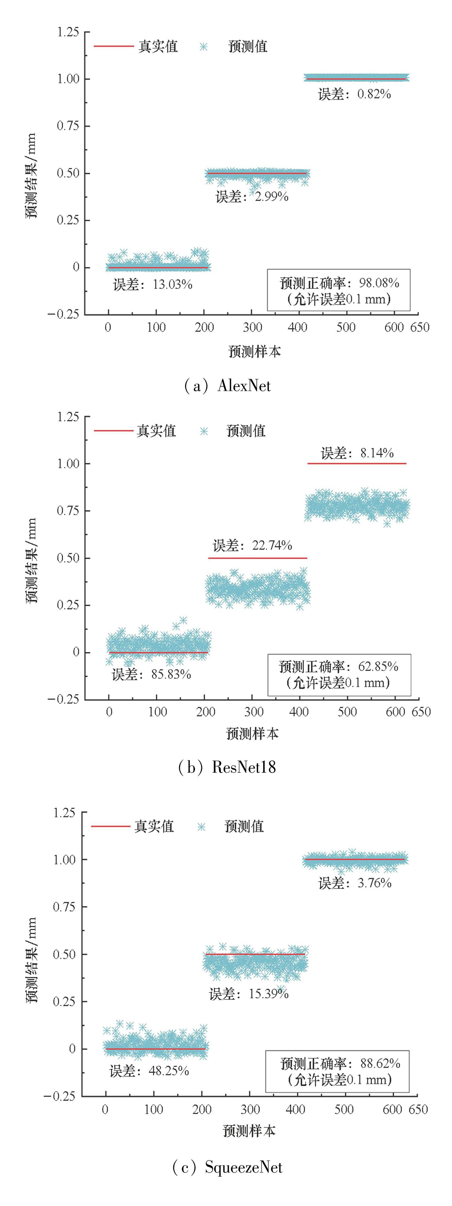 通过短时傅里叶变换将一维数据转换为二维彩色图像,并将其作为卷积神经网络的输入。为说明结果的稳定性,每种训练数据占比下随机选取5组训练/测试样本进行测试,每次的训练/测试样本均随机产生。图19所示为训练数据占比为60%时三种卷积神经网络在不同偏心量数据上的预测结果,此结果为5次训练/测试的平均值。