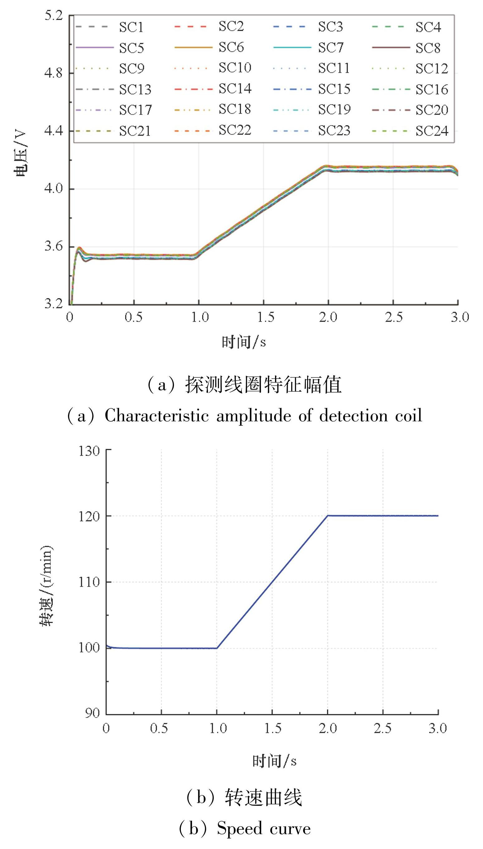 电机转速从100 r/min增加到120 r/min期间计算得到的特征量幅值如图3(a)所示,其中图3(b)展示出了转速的变化过程,可见,随着转速的变化提取到的特征值也随之变化,但在任意时刻各探测线圈中提取到的特征值相等。