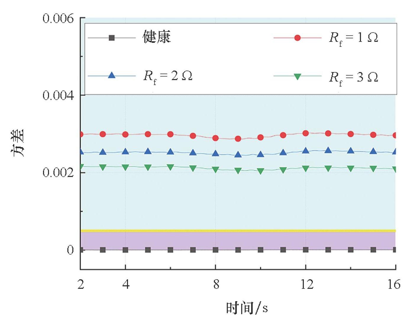 为了进一步衡量故障程度,定量描述图4(b)中的凹陷程度,以每一时刻所有探测线圈归一化后的特征值方差作为故障程度指标,得到不同短路电阻下的检测结果如图5所示,其中,Rf表示故障电阻。分析发现,当电机处于健康状态时,特征值方差接近于零,一旦出现匝间短路故障,特征值方差会明显大于零,且随着短路电阻的减小,即故障程度的增加,特征值方差也随之增大。