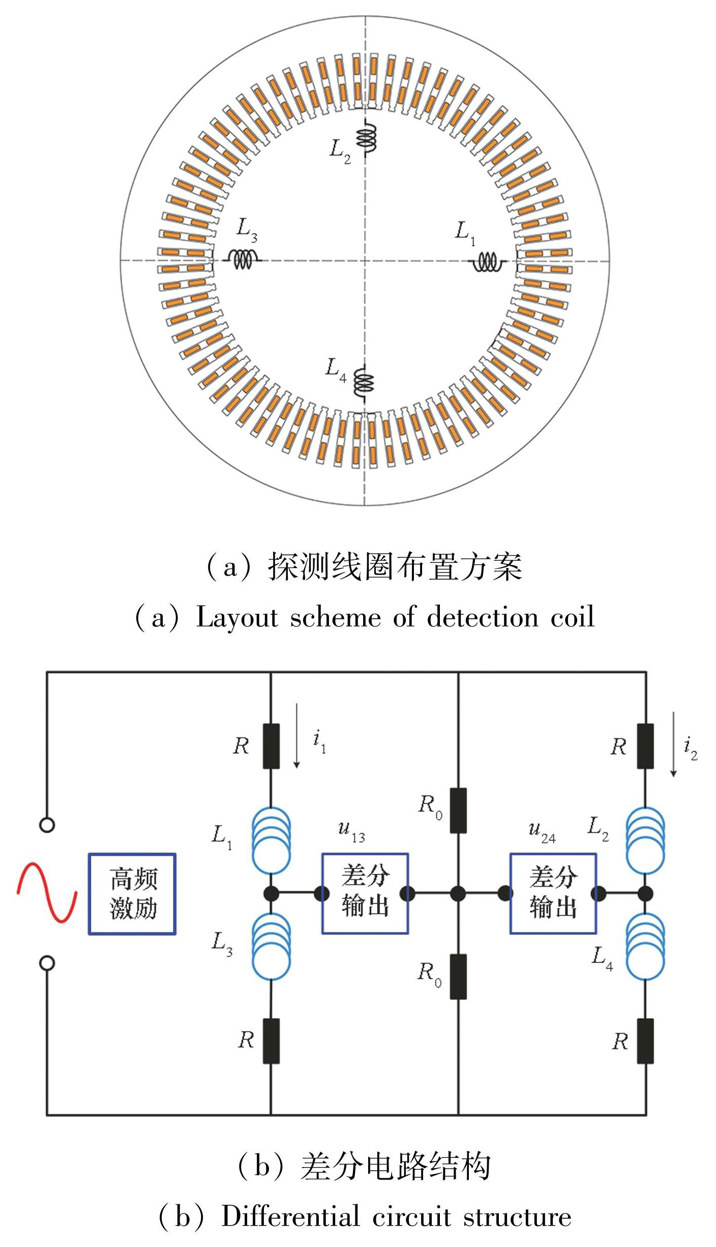 转子偏心直接导致气隙长度变化,进一步影响探测线圈的电感值,将多个探测线圈合理布置构成差分电路,由偏心故障导致的电感变化将使得差分输出不再为零。同时,为了克服常规偏心故障检测方法易受电机运行工况的影响,提出在探测线圈中注入高频信号,通过检测与注入频率相关的特征分量来检测偏心故障的方法。基于差分式探测线圈检测转子偏心故障的布置方案如图7(a)示,L1和L3用来检测水平(横向)转子位移,L2和L4用来检测竖直(纵向)转子位移。
