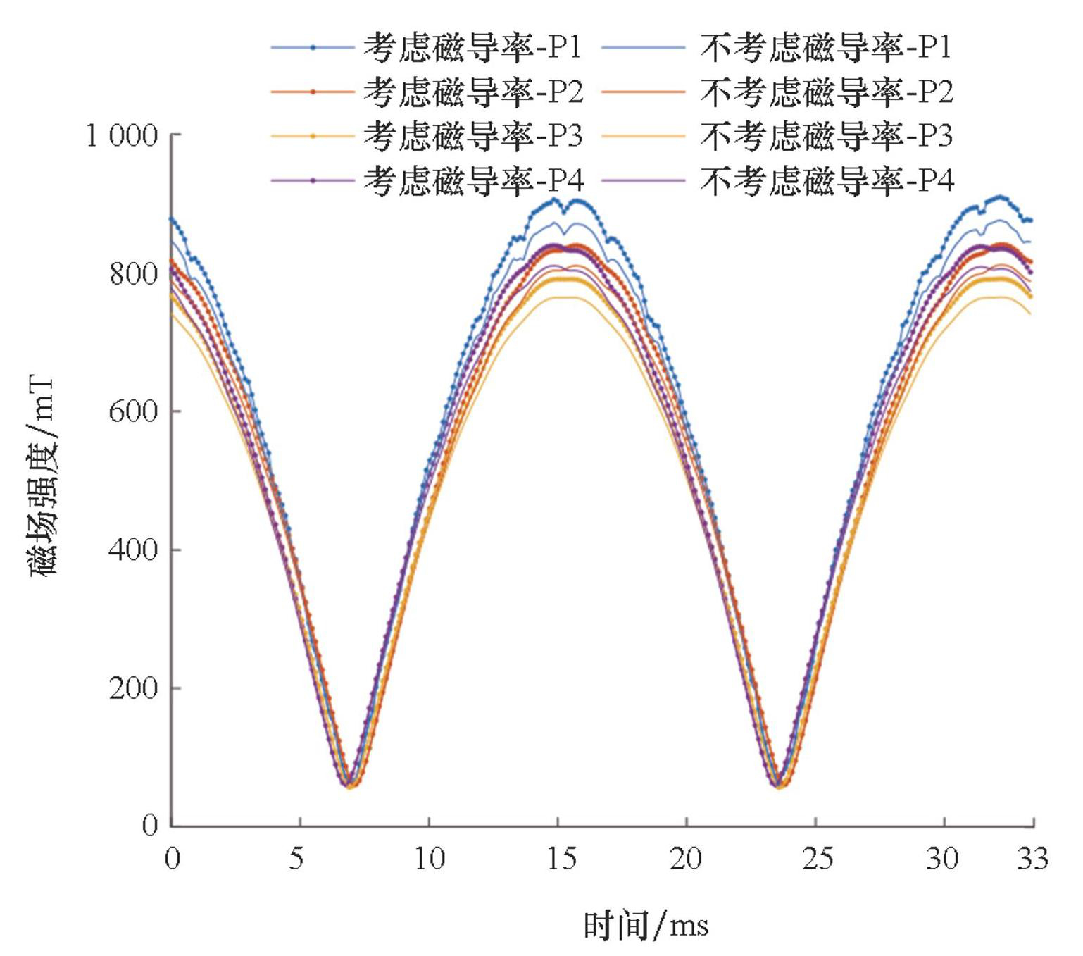 考虑永磁体材料属性以及不考虑永磁体材料属性时四个点在一个电周期内的气隙磁密波形如图8所示。