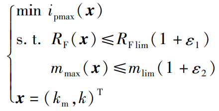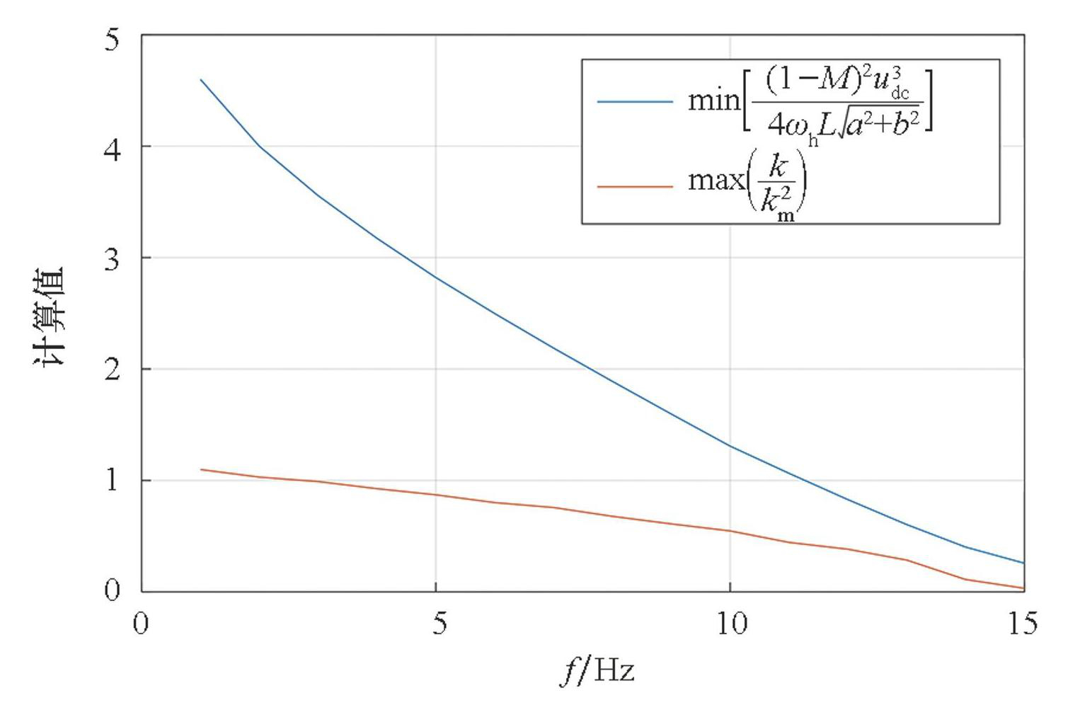 基于第3节计算得到的最优参数表,式(33)左右两边表达式的最大值和最小值随频率变化的结果如图8所示。从图中可以看出,不等式左边恒小于右边,因此mmax随着km单调递增。
