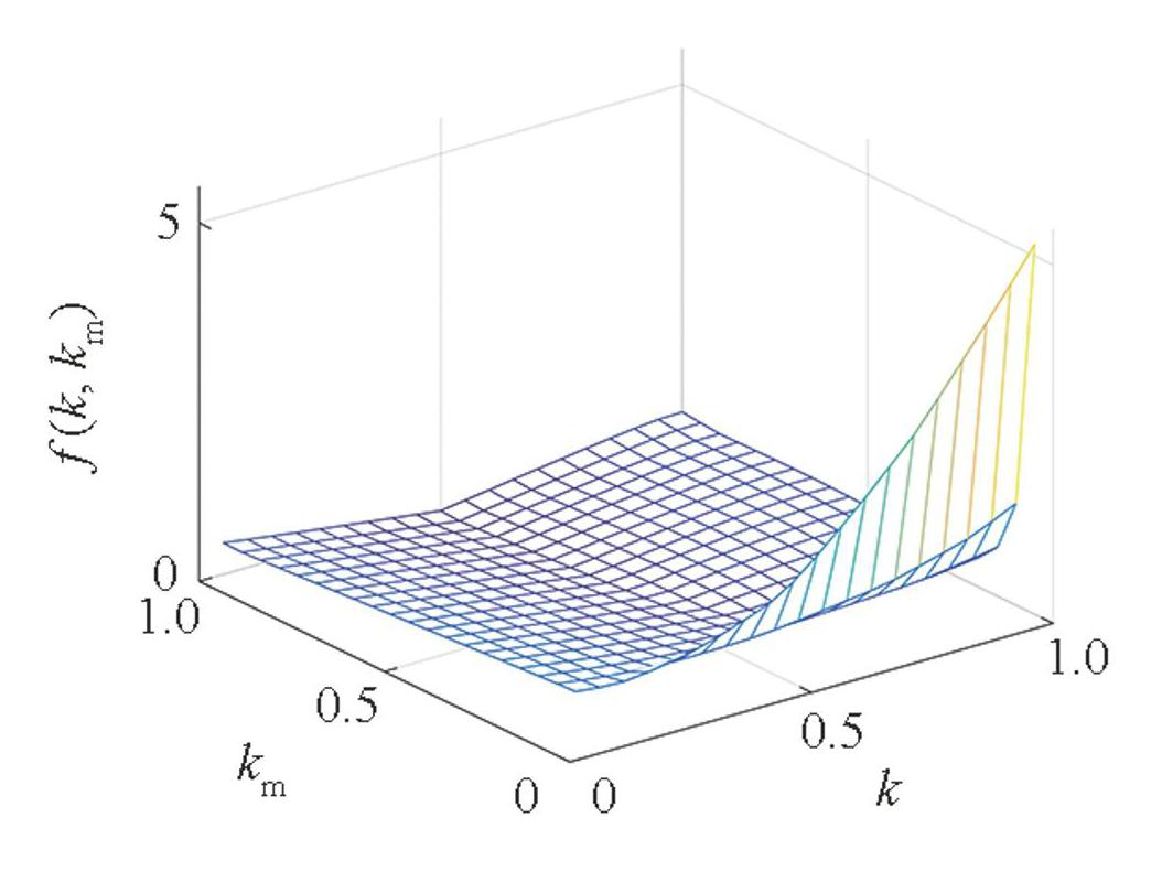 Fig.4Objective function varies with km and k (f=5 Hz, TL=0.4p.u.)