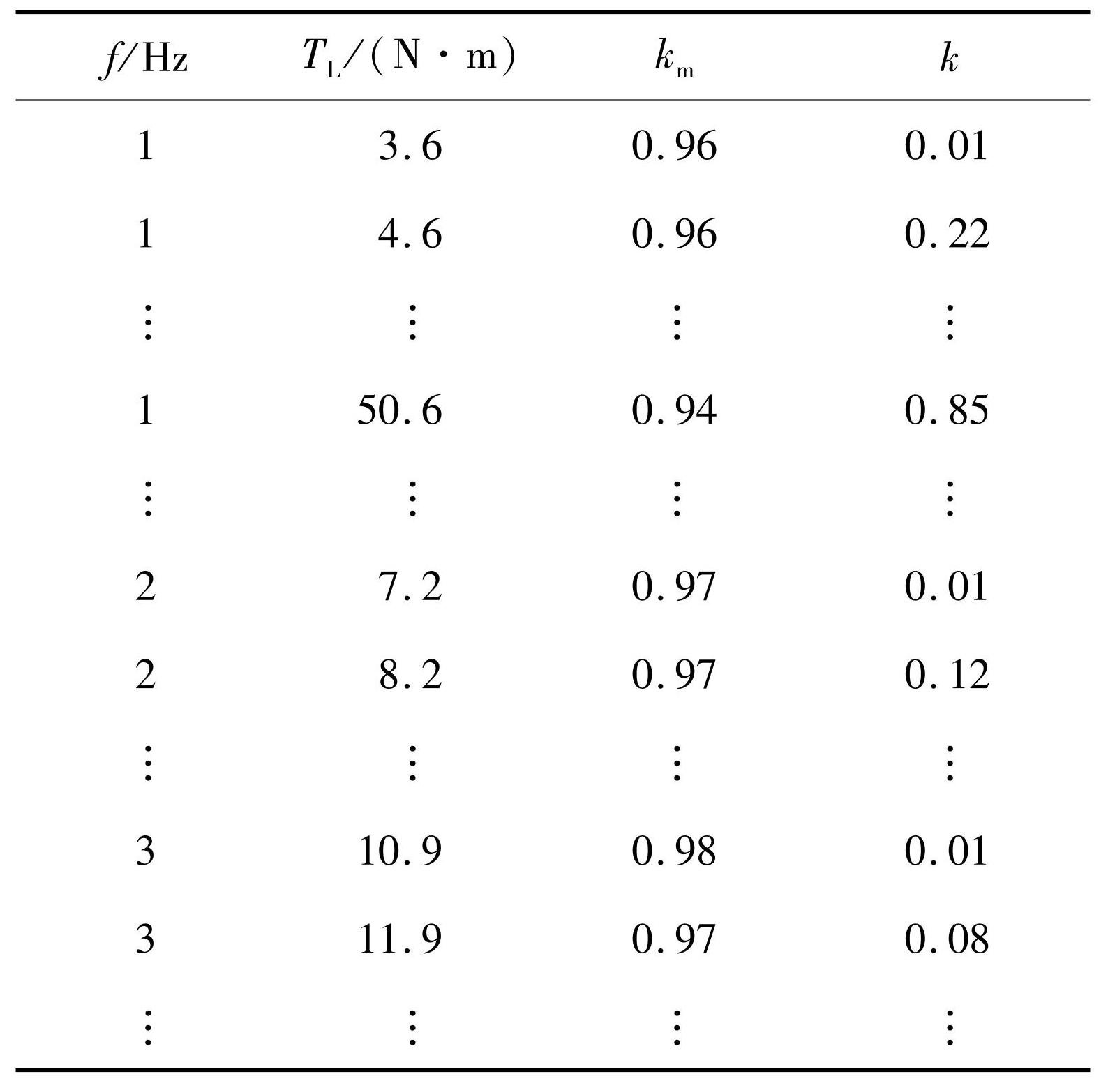 基于最优注入参数计算方法,以固定的步长Δf、ΔTL遍历电机频率f∈[fminfmax] 与负载转矩 TL∈[TLminTLmax] 构成的工况空间,求解每个工况点(fTL)下的高频注入参数最优解(kmk),最终生成以(fTL)为索引的高频注入参数基准表。表的覆盖密度与工况范围需根据实际应用需求设计,本文取Δf=1 Hz,ΔTL=1 N·m, f∈[1 Hz,15 Hz] 与负载转矩 TL∈[TL_switchTL_rate](TL_switch为当前频率的切换点转矩,TL_rate为额定转矩),计算得到的参数基准表如表4所示。在具体应用时,将离线计算得到的最优高频注入参数基准表固化到控制器中,可快速匹配当前工况需求。